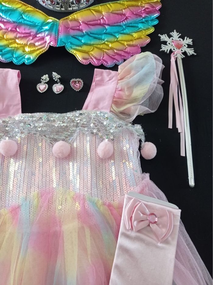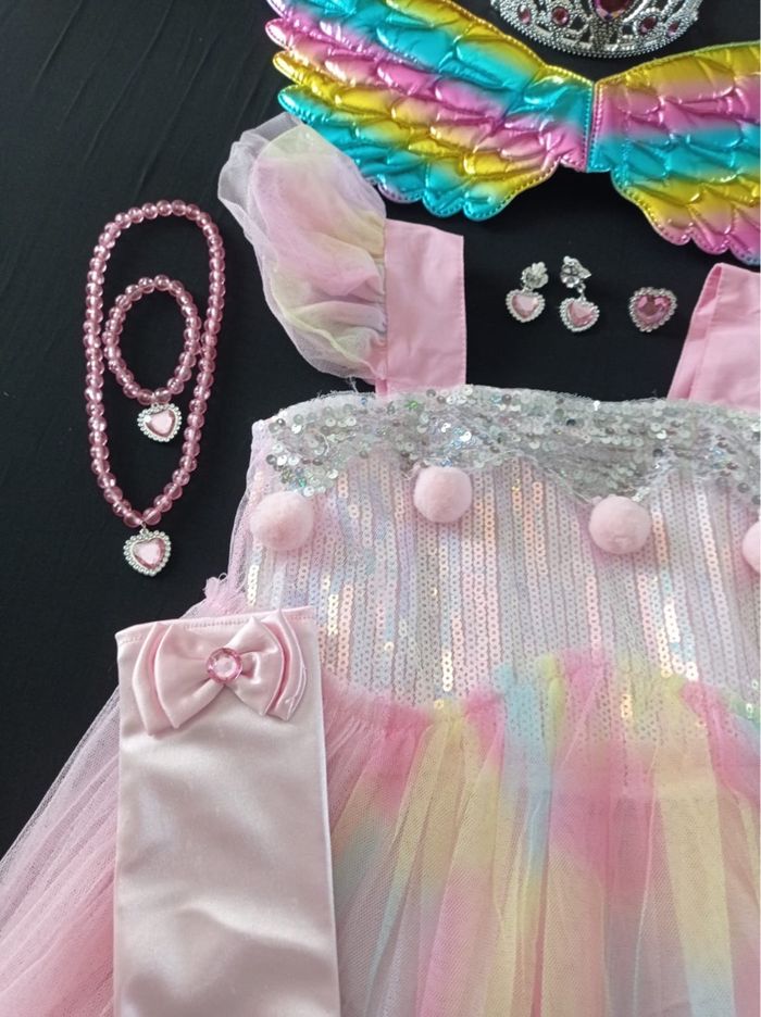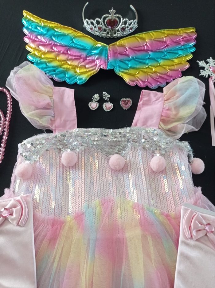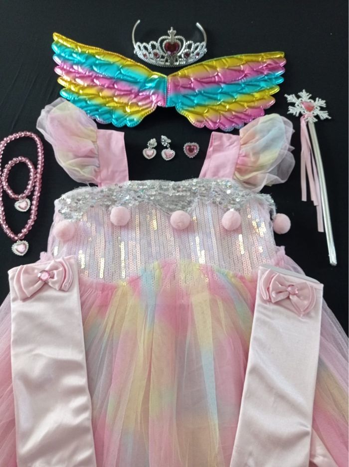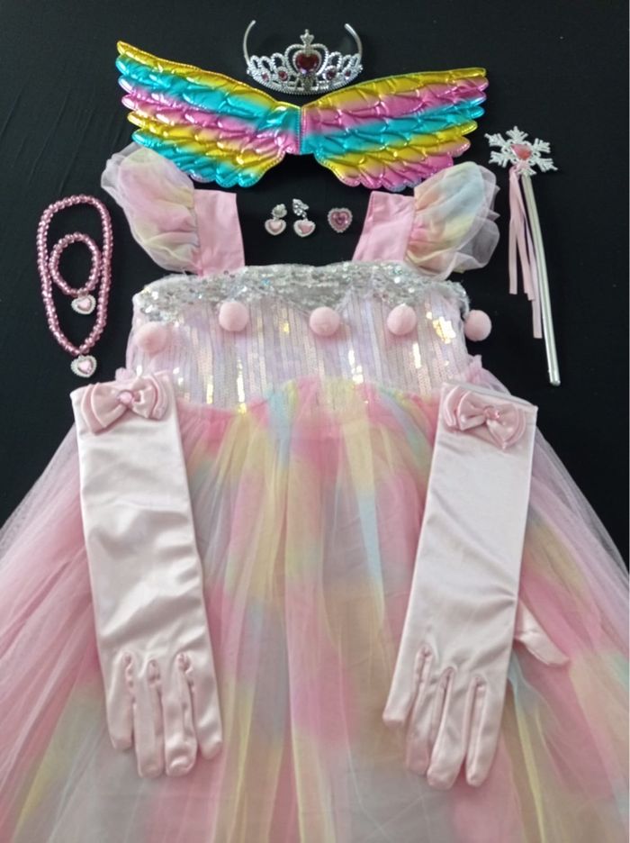 Déguisement robe princesse licorne rose et ces accessoires (couronne, baguette, gants, bijoux, aile). La robe mesure 85cm de longueur, la taille convient aux petites filles de 6ans. Totalement neuve, vendue dans son emballage d’origine. Expédition rapide après votre commande