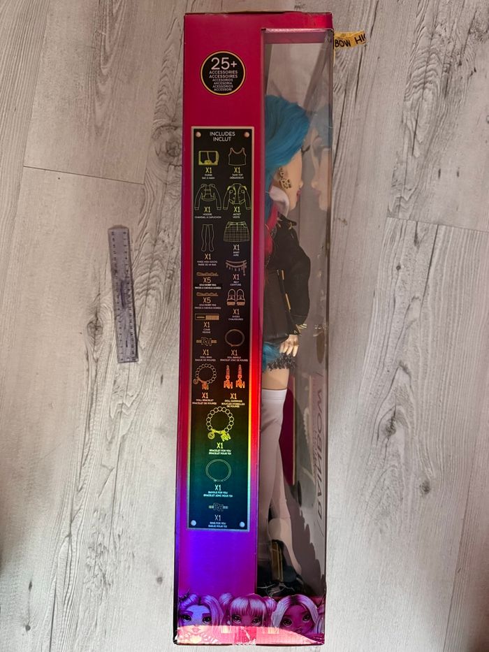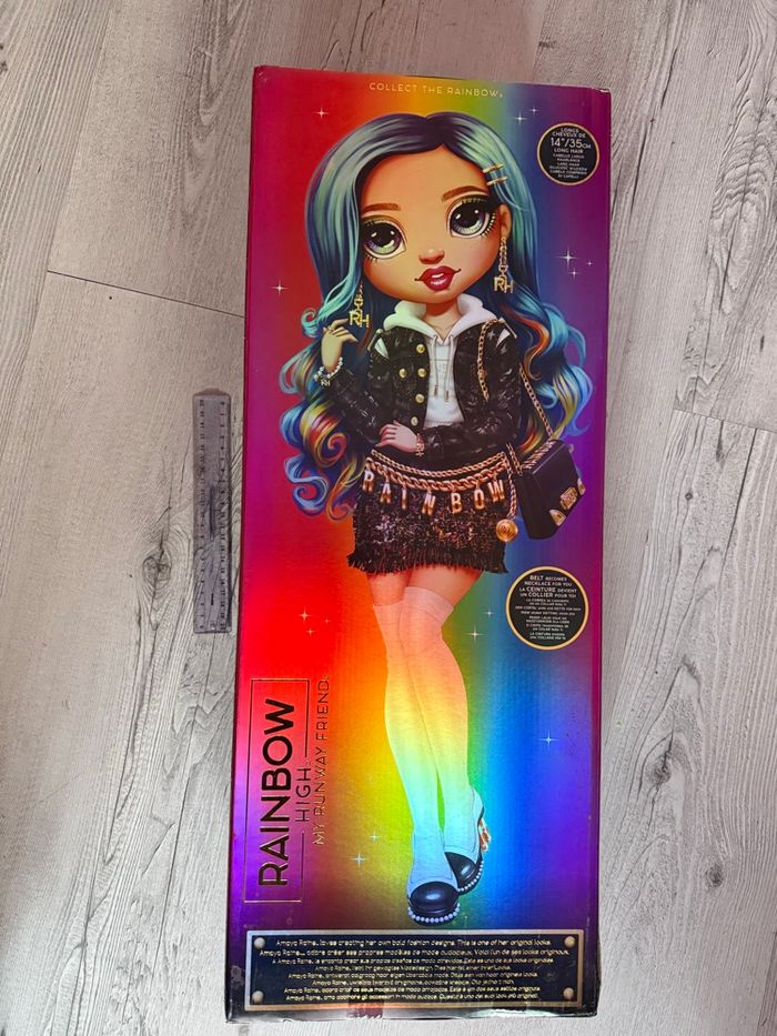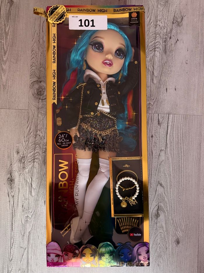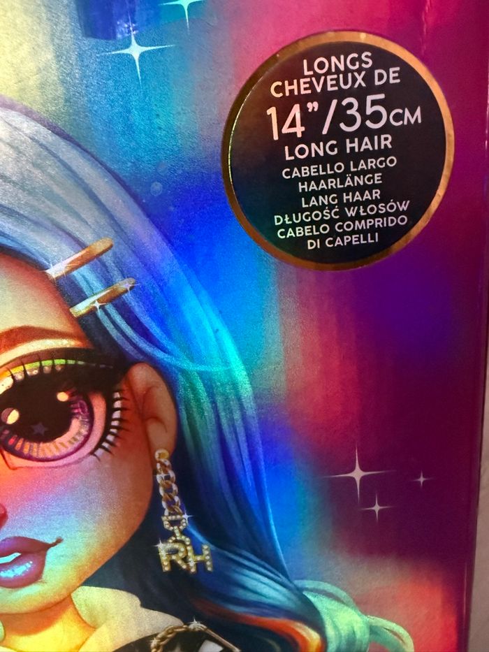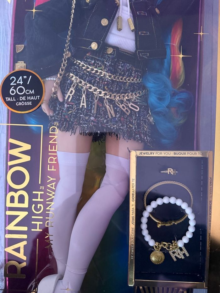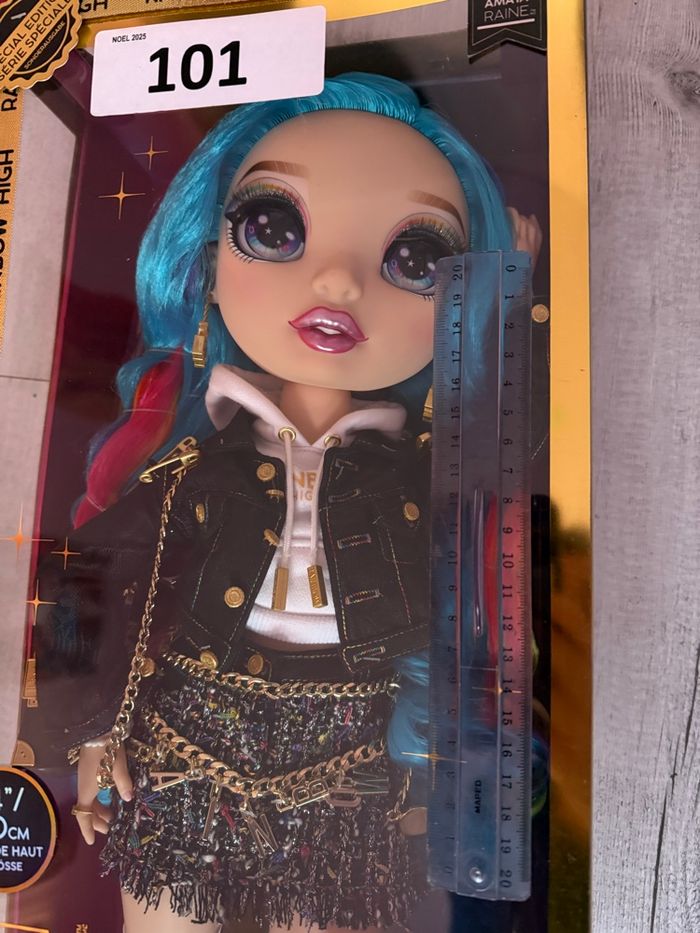 La grande poupée de 60 cm de Rainbow High est très élégante avec ses 17 points d’articulation, vous pouvez créer les poses les plus tendance. Des accessoires pour vous & votre poupée avec de beaux bijoux assortis ! Un indispensable à chaque collection de poupées. Amaya aime créer ses propres modèles de mode, c’est un de ses looks originaux. Ses articles de mode sont dotés de détails incroyables, de boutons et fermetures éclair fonctionnels et les talons de ses chaussures sont en forme de “R” et “H.” Elle porte une veste en jean noire, un sweat à capuche blanc avec un imprimé Rainbow High dessus, un débardeur, une jupe, des chaussettes qui montent jusqu’aux genoux et plus. Les cheveux de 35 cm d’Amaya sont aussi magnifiques que ses tenues, elle est dotée de longs cheveux couleur arc-en-ciel à coiffer et est fournie avec un peigne et des barrettes afin de créer des coiffures à l’infini. Des accessoires pour vous & Amaya avec sa ceinture tendance dotée de breloques qui vous sert de collier ! Elle est aussi dotée d’accessoires assortis pour vous et elle. Fourni avec 1 poupée, 1 paire de chaussures tendance, 1 sac de poupée, 2 bracelets, 1 bague de poupée, des boucles d’oreilles de poupée, 2 bracelets de poupée et des accessoires tendance pour vous, 2 bracelets & 1 bague. Dotée également de 5 barrettes argentées, 5 barrettes dorées et un peigne. Regardez la série animée sur YouTube & Netflix ! Collectionnez l’arc-en-ciel ! Jumelles : Laurel & Holly De'Vious, édition de collection Jett Dawson, Krystal Bailey, Amaya Raine, Stella Monroe, Bella Parker, Karma Nichols, River Kendall. CONSEIL DE PRO : Quand vous sortez la poupée mannequin, lavez soigneusement pour retirer le gel et laissez les cheveux sécher entièrement. Collectionnez-les toutes. Krystal Bailey, Amaya Raine, Stella Monroe, Bella Parker, Karma Nichols, River Kendall. Comment laver ses cheveux : 1. Retirez ses vêtements ou recouvrez-la d’une serviette pour les protéger. 2. Mouillez entièrement ses cheveux. 3. Faites mousser avec un peu de shampoing ou de liquide vaisselle pour retirer tout résidu. 4. En option : Pour adoucir ses cheveux, ajoutez l’après-shampoing et massez avec les doigts ou peignez, puis rincez. 5. Séchez entièrement les cheveux.