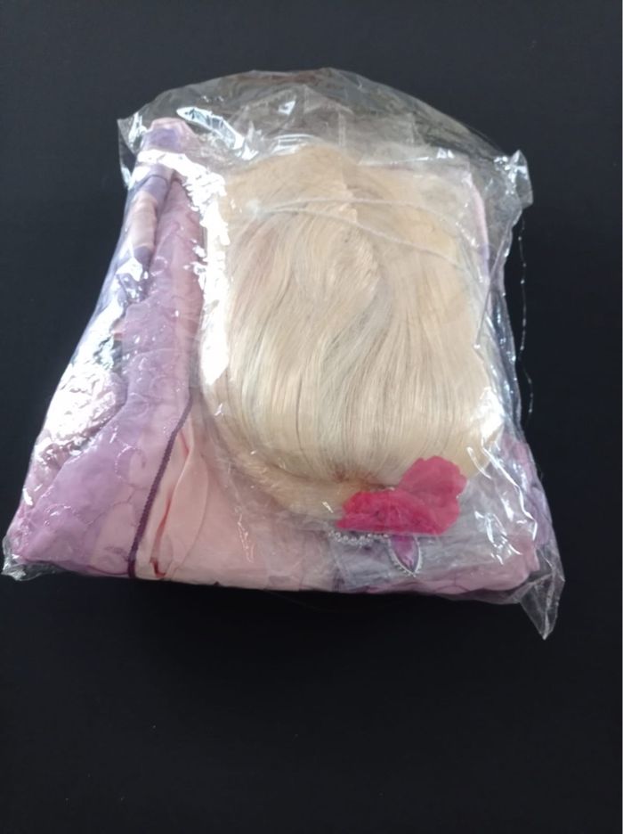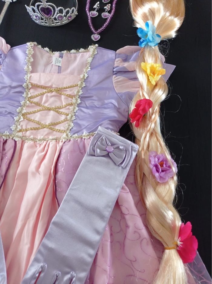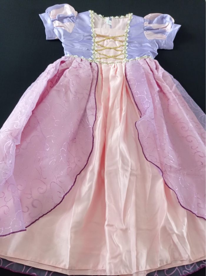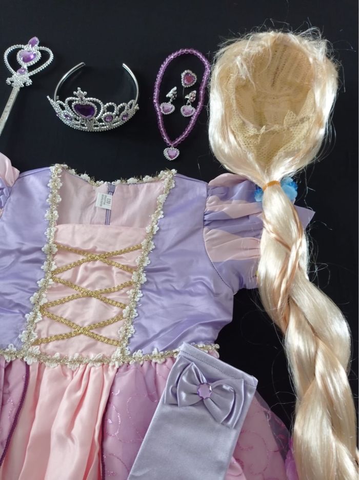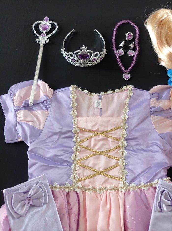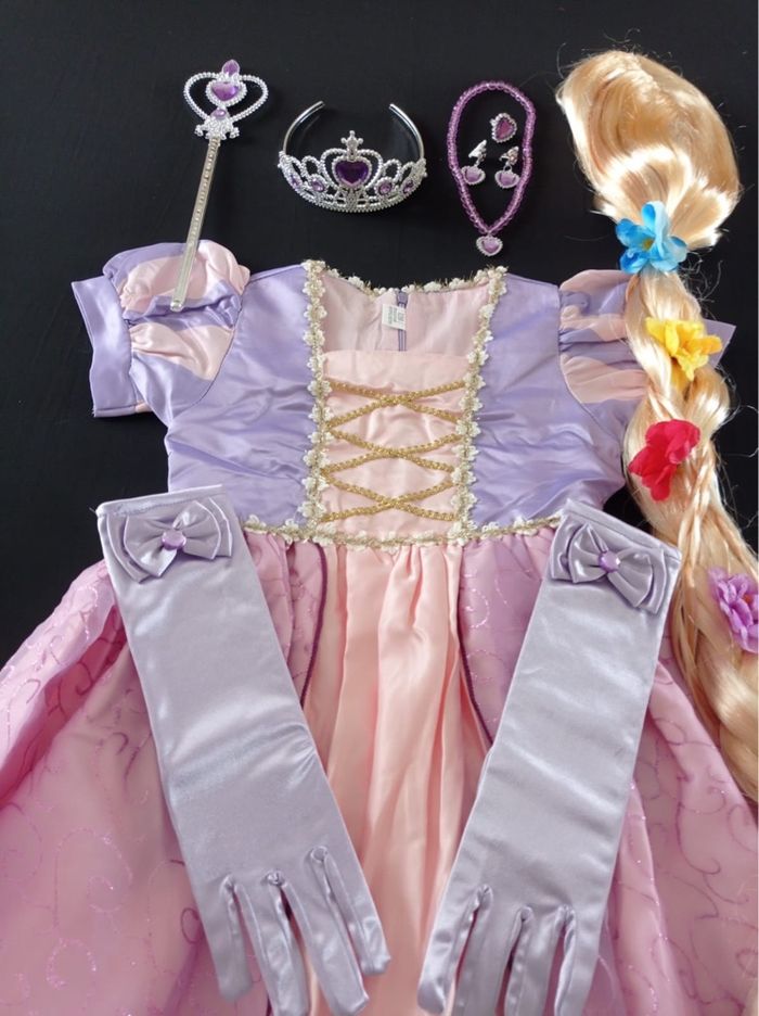 Déguisement robe princesse violette et ces accessoires (couronne, baguette, gants, bijoux, perruque). La robe mesure 80cm de longueur, la taille convient aux petites filles de 5ans. Totalement neuve, vendue dans son emballage d’origine. Expédition rapide après votre commande