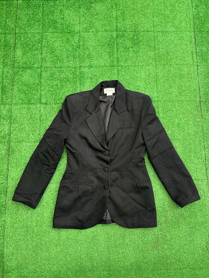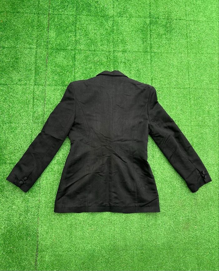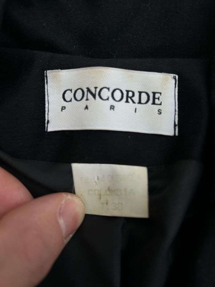 Veste blazer noire cintrée Concorde Paris, idéale pour le bureau ou une tenue habillée. Hauteur environ 70 cm, largeur à plat sous aisselles environ 43 cm, taille 38. Fabriquée en France, composition 100% polyester, doublée, fausses poches à l’avant, fermeture par 3 boutons ton sur ton. Aucune anomalie ou défaut visible, prête à porter.