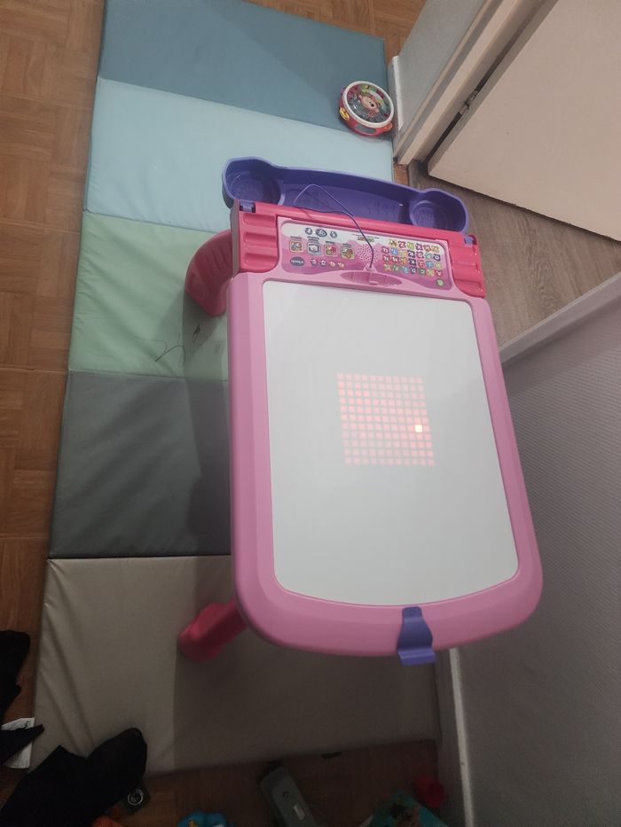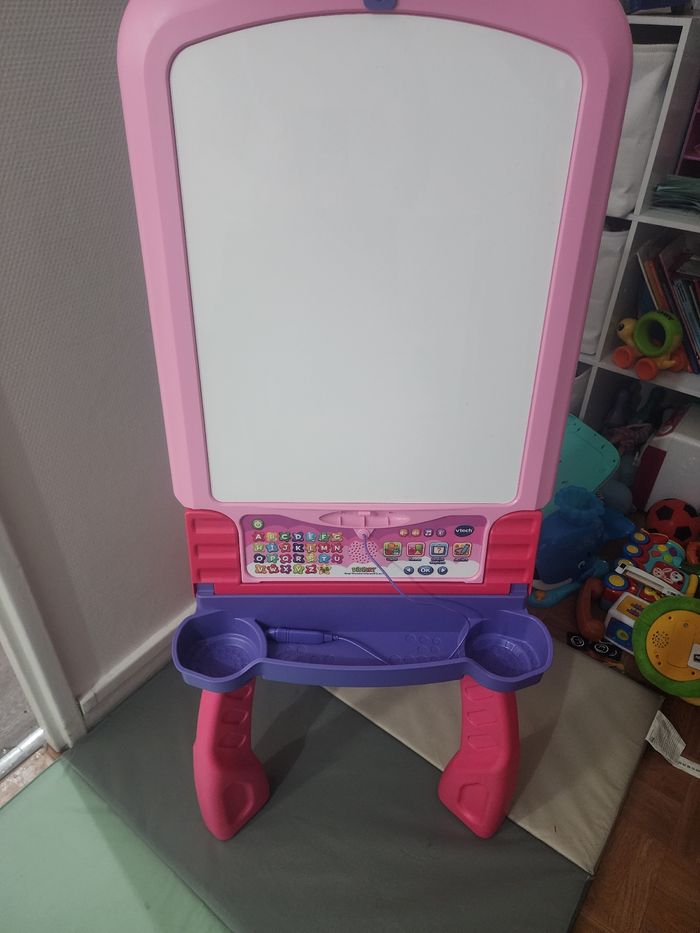 Comme neuf offert en septembre Jamais utilisée ⚠️ a venir recuperer dans le val de marne Chevalet Avec un écran interactif lumineux pour apprendre à tracer les lettres, les chiffres de 1 à 20, 40 objets et 12 formes… L'enfant apprend à tracer les lettres en suivant les lumières qui s'allument une à une à l'écran ! Grâce au stylet magique inclus, l'enfant réalise des dessins pas à pas ! Génial : une fois terminés, les dessins prennent vie et l'enfant découvre une animation ! L'enfant peut aussi dessiner sur toute la surface blanche avec des feutres effaçables. Tableau noir Pour dessiner à la craie (non incluse) ou jouer au maître ou à la maîtresse. Bureau / Table à dessin Pour continuer son dessin dans une position plus confortable. Des voix et des effets lumineux se déclenchent lorsque l'enfant se met à dessine Un porte crayon/porte-craies inclus Un mode Musique avec 10 mélodies pour dessiner en musique + de 150 lettres, nombres, formes et objets
