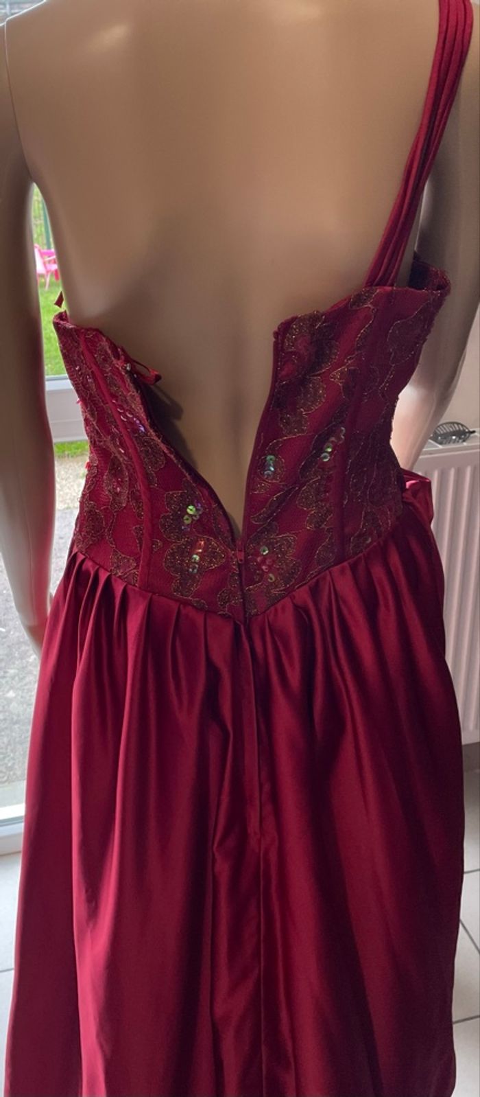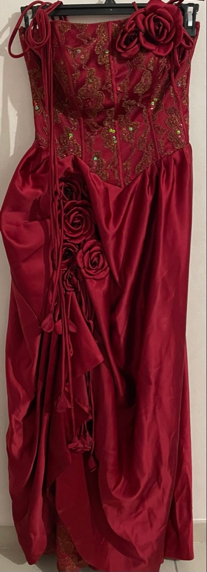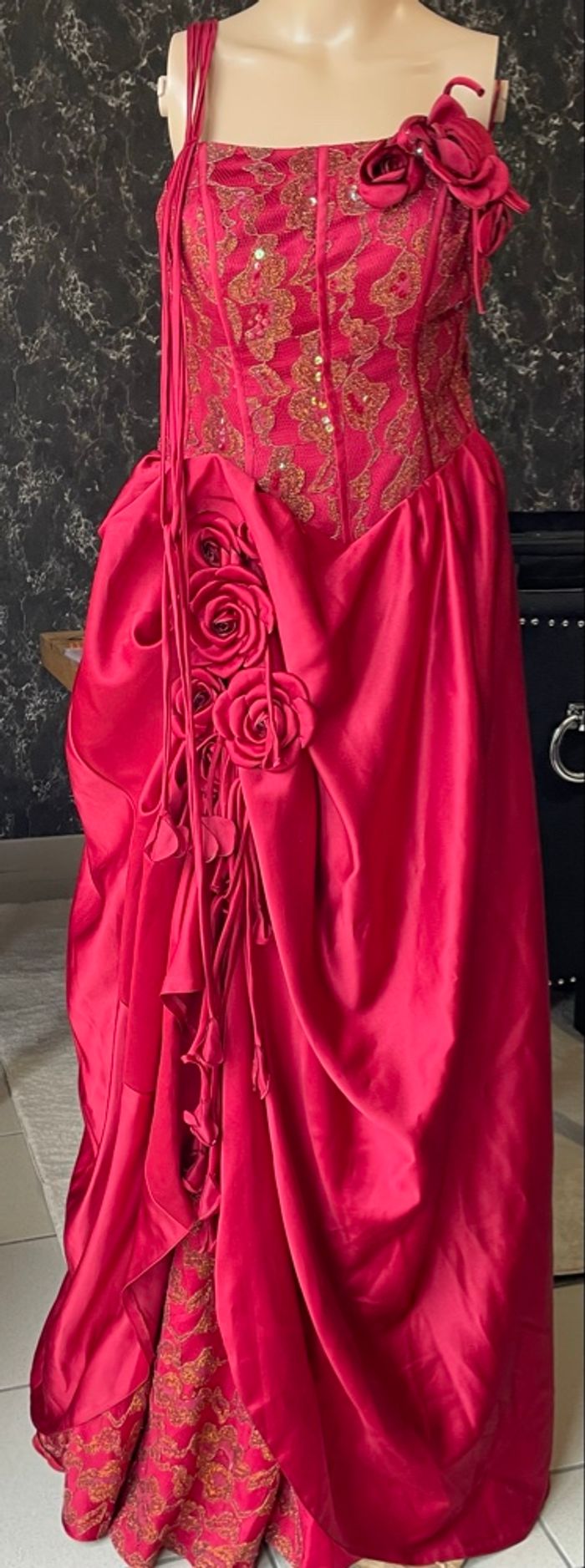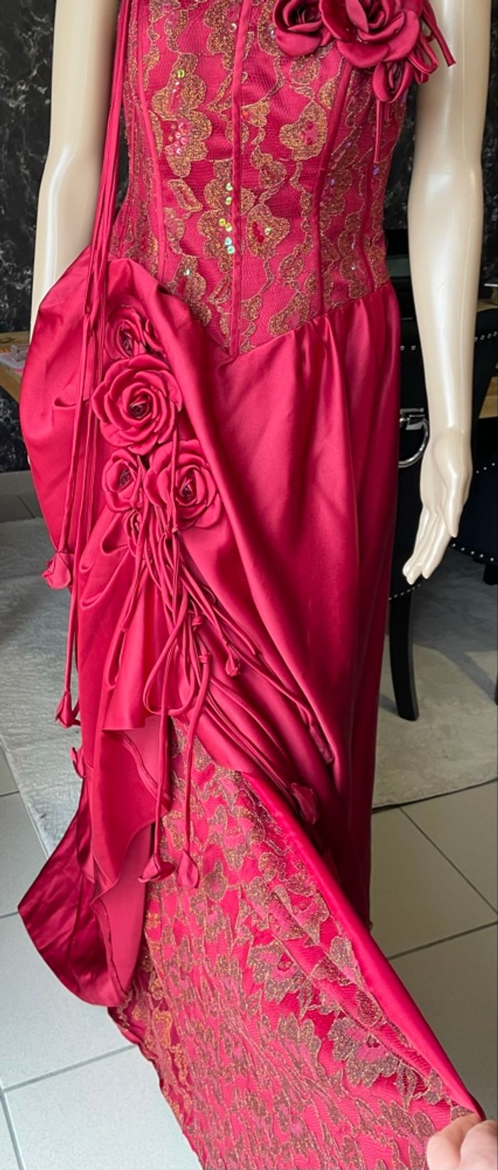 Décorations florales Roses en tissu satin sur le côté gauche de la robe Plusieurs volumes floraux, effet drapé travaillé, très décoratif Style inspiré des robes de gala ou robes “princesses” Jupe asymétrique avec un grand drapé Panneau central en dentelle rouge brodée or Volume relativement ample, sans être une robe boule Petites superpositions de tissus pour donner de la structure.Dos fermeture à glissière + Bretelles fines
