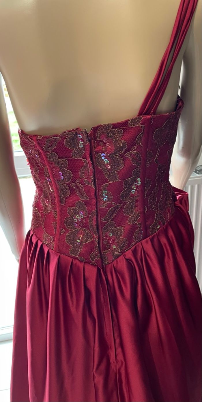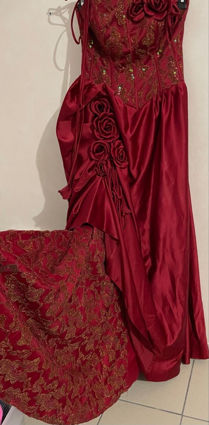 Couleurs Rouge profond Broderies dorées avec paillettes, apportant un effet scintillant Matières Satin : tissu principal de la jupe et des drapés, brillant et fluide. Dentelle brodée : utilisée pour le panneau central de la jupe et pour le corsage, avec motifs floraux dorés. Sequins : intégrés sur la dentelle du corset, ajoutant du reflet.