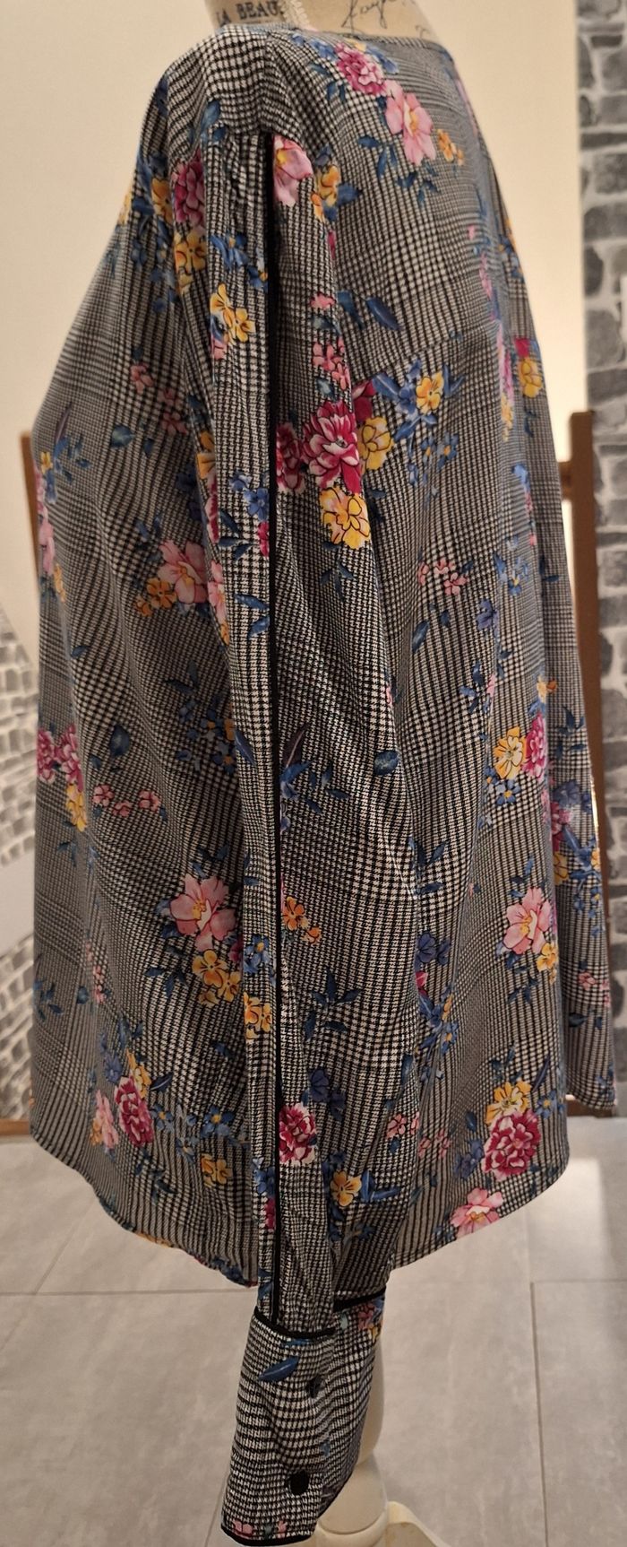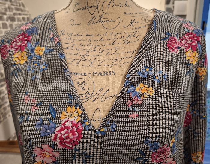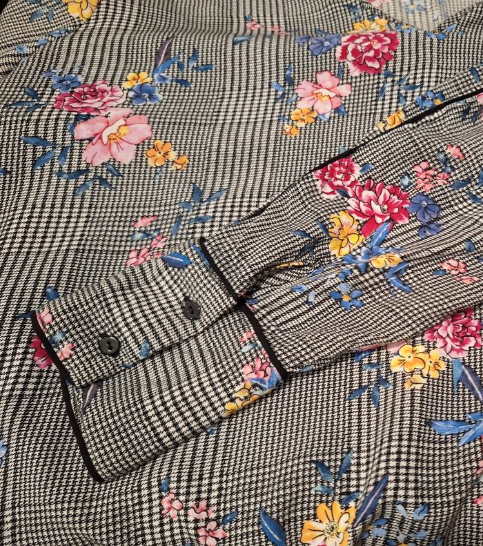 Blouse vichy noire et blanche à l'imprimé fleuri multicolore
