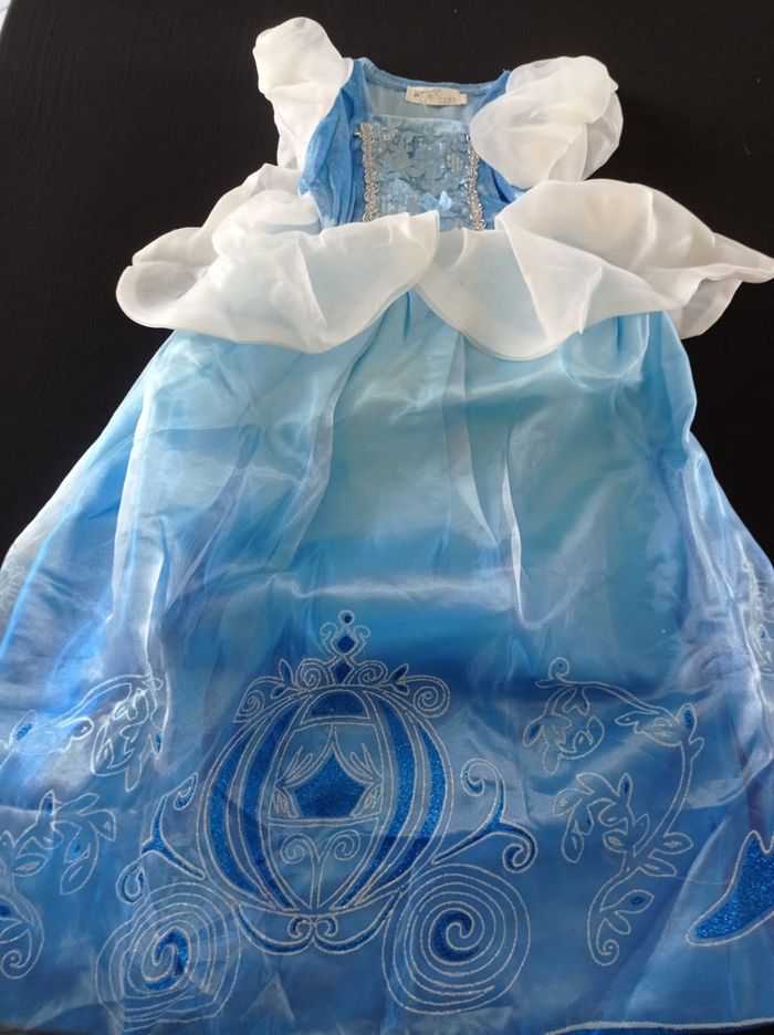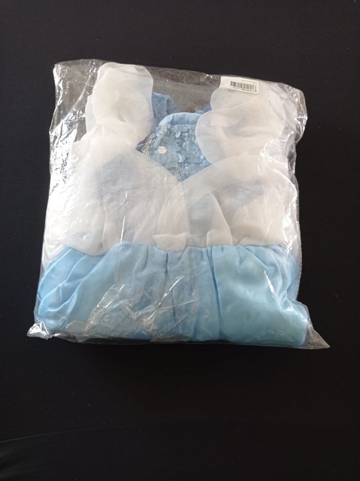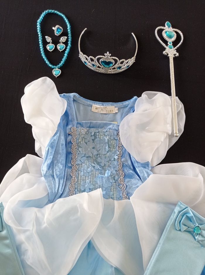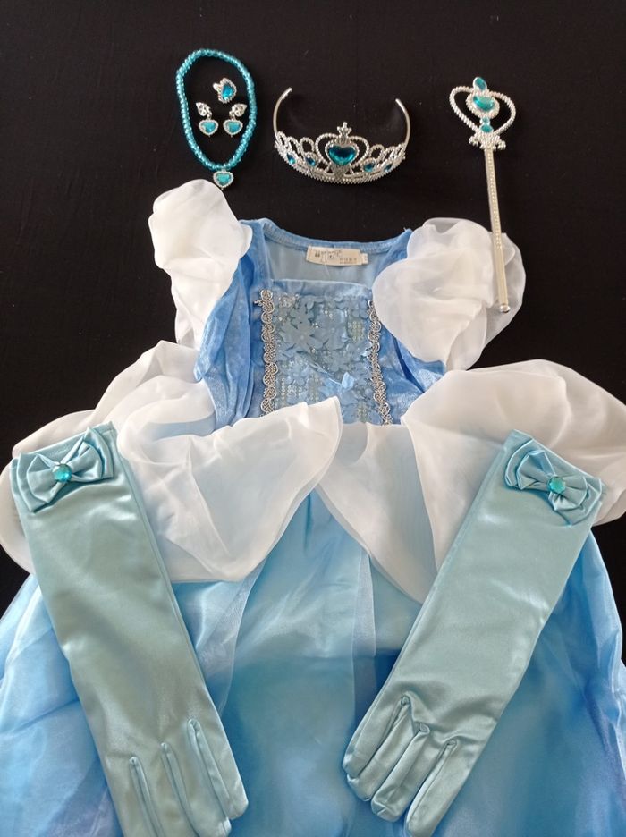 Déguisement robe princesse blanche et bleu et ces accessoires (couronne, baguette, gants, bijoux). La robe mesure 70cm de longueur, la taille convient aux petites filles de 3-4ans. Totalement neuve, vendue dans son emballage d’origine. Expédition rapide après votre commande