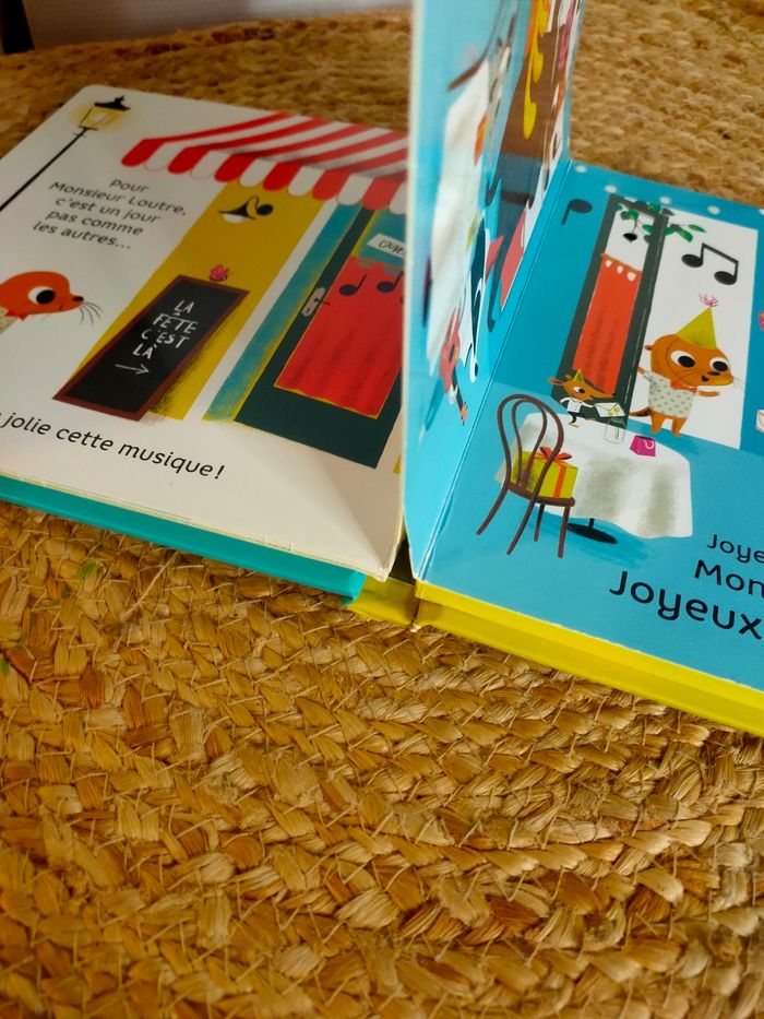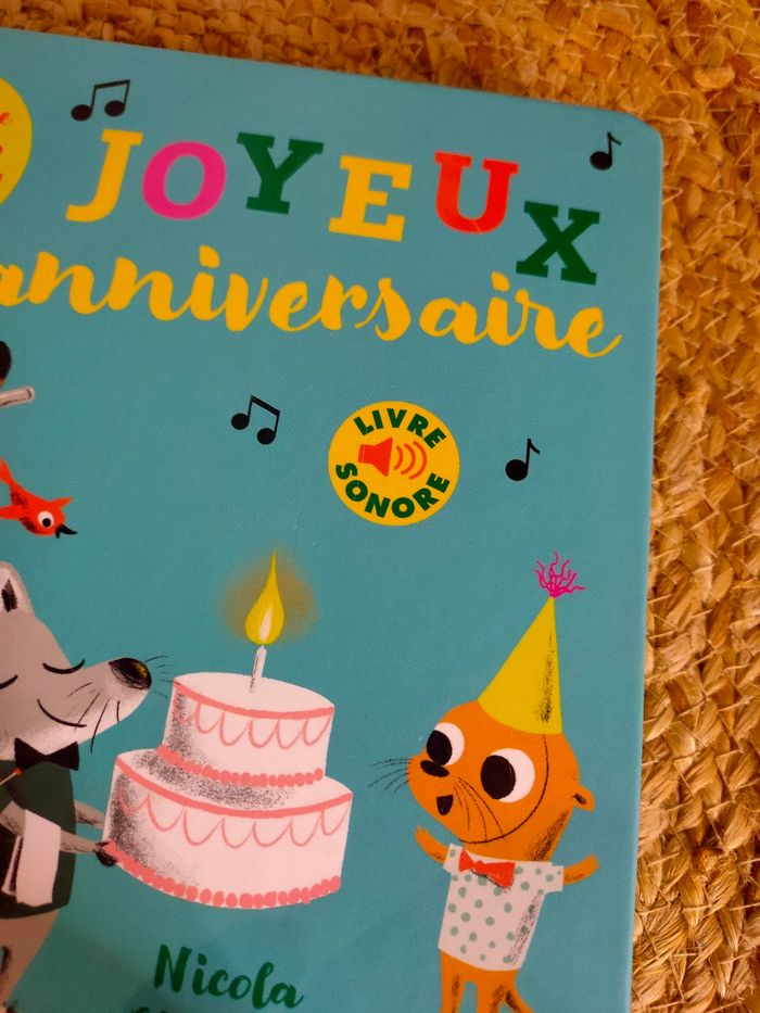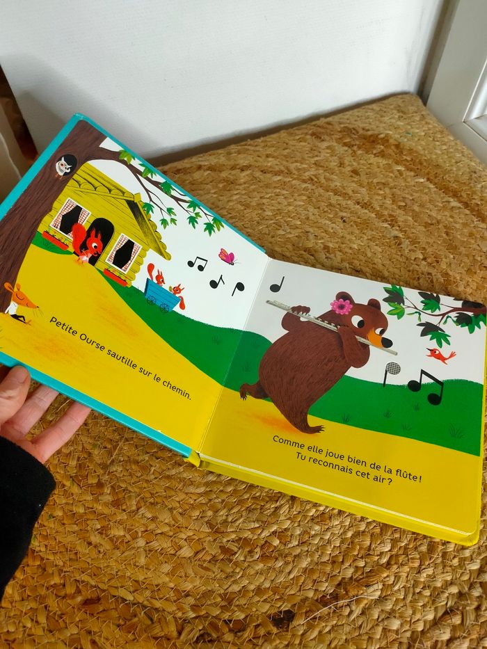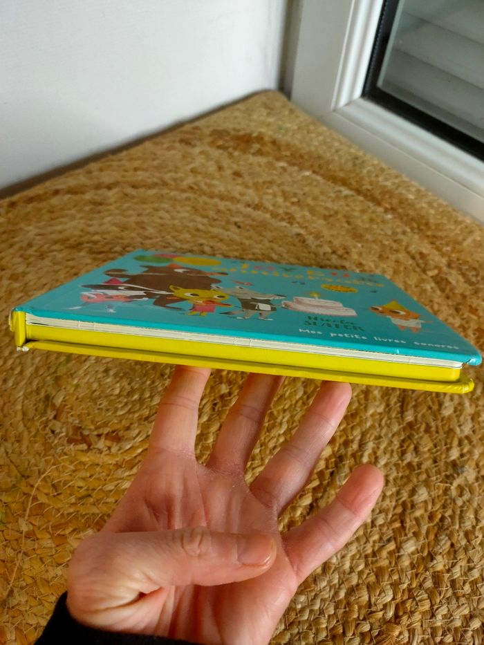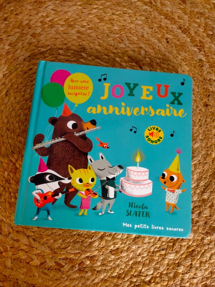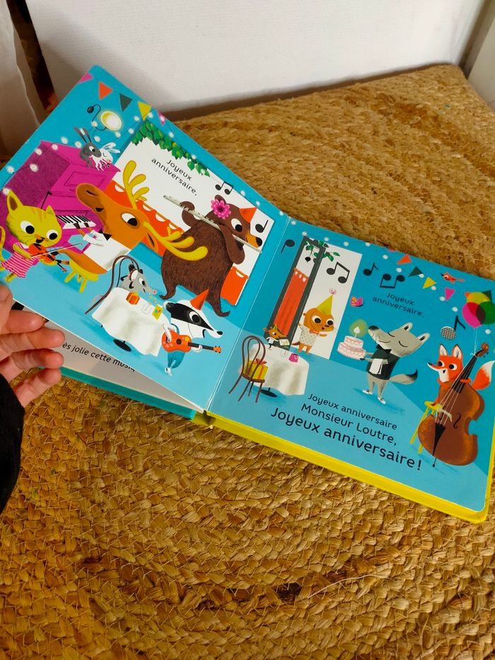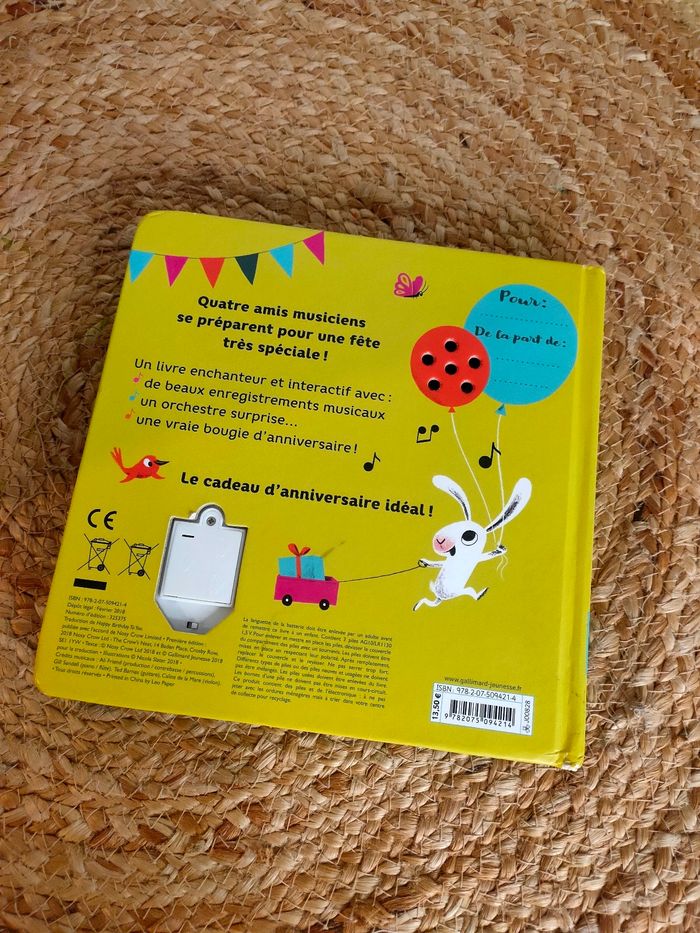 Quatre amis musiciens se rendent à une fête très spéciale. Flûte, guitare, violon et violoncelle : chacun joue sur le chemin un extrait de "Joyeux anniversaire". Enfin, voilà leur ami : ils reprennent l'air tous ensemble pour fêter son arrivée ! Et lui faire souffler sa bougie ! Le livre a été manipulé, il a quelques traces mais reste en très bon état. Les piles sont neuves, elles ont été changé pour la vente, le livre fonctionne parfaitement.