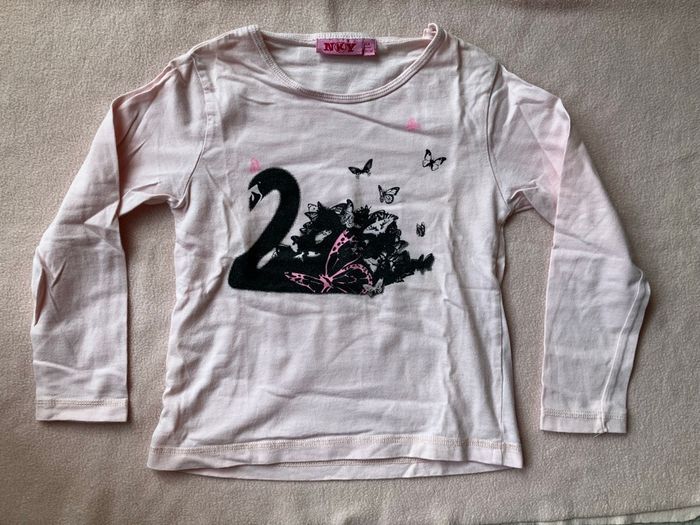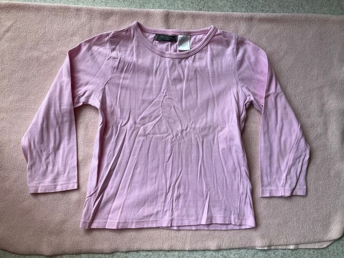 - Haut ML rose clair Kiabi (NKY) noté 5 ans (110 cm) qui taille plutôt 3 à 4 ans / 29-30 cm de largeur sous les bras, 37 cm de longueur.