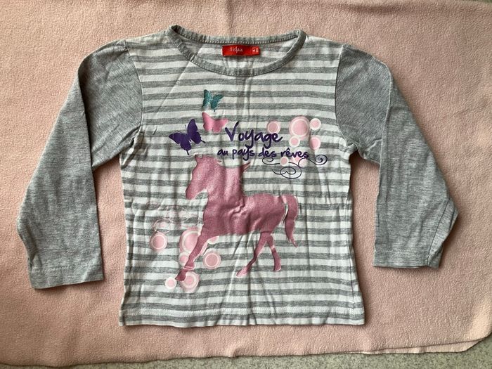 - Haut de Pyjama Tissaia 3/4 ans / Cheval + 1 papillon pailletés / 95% Coton, 5% Viscose / 31 cm de largeur sous les bras, 38 cm de longueur.