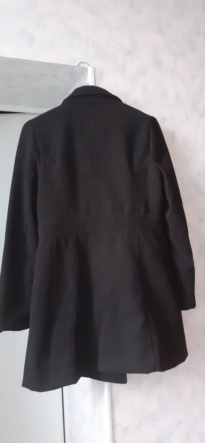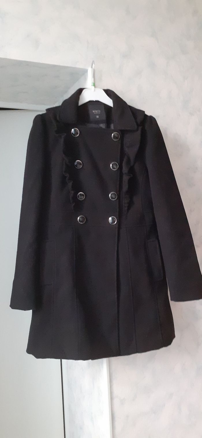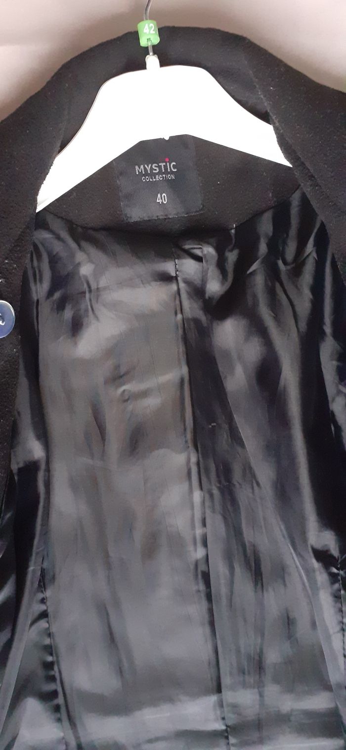 Vends un manteau droit, un peu cintré dans le dos, 83 % polyester, 16 % viscose, 1 % élasthanne, doublure 100 % polyester, 2 poches latérales, double rangée de boutons, 2 rangées de fronces devant, couleur noir, marque Mystic Collection, taille 40.