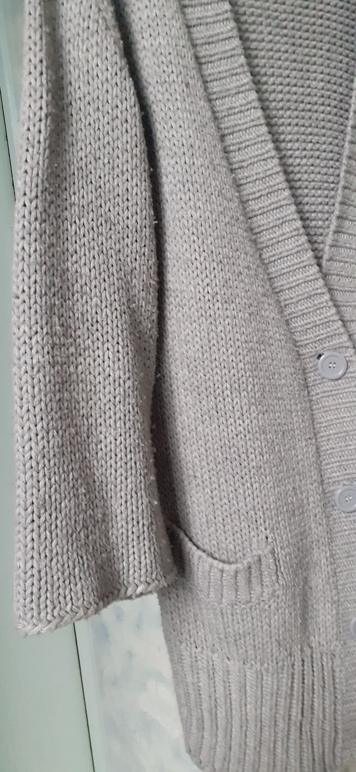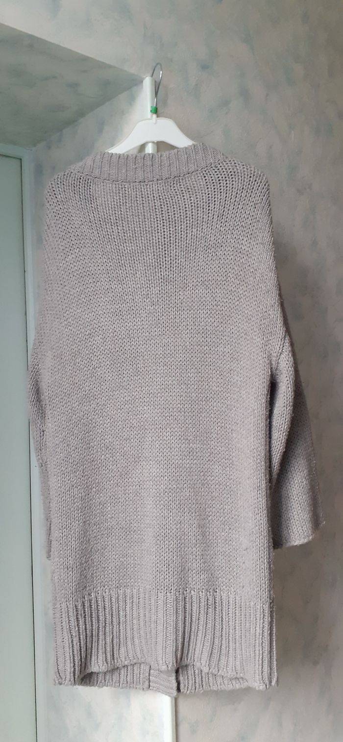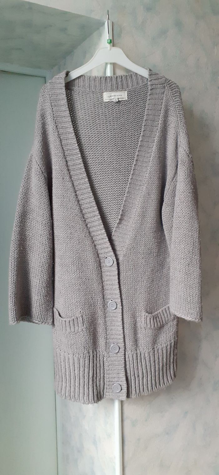 Vends un gilet en grosses mailles laine et acrylique, long et chaud, manches larges, 2 poches, couleur gris, marque Bershka, taille M 28 Mex sur l'étiquette, taille grand 38-40.