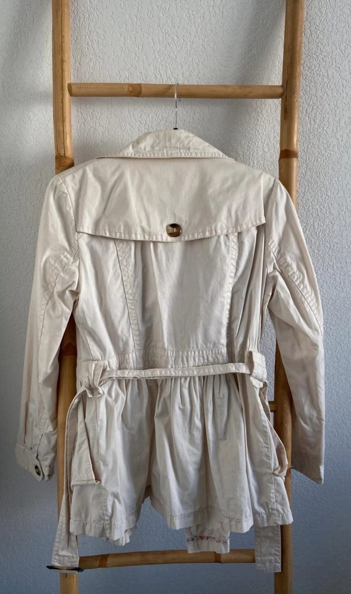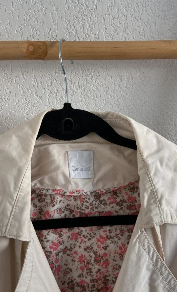 Vends un imperméable court et cintré 100 % polyester avec doublure 100 % coton, empiècement dans le dos avec un bouton, 2 poches latérales, un bouton aux poignets, ceinture avec boucle, couleur crème avec doublure à petites fleurs sur le haut du dos, marque Camaïeu, taille 40.