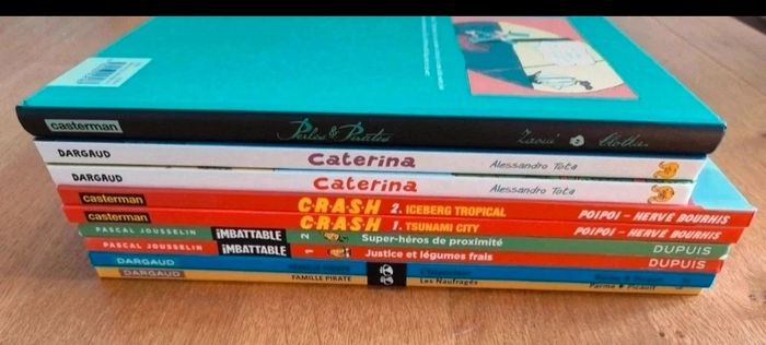 2 bd Famille pirate + perles et pirates + 2 bd Crash (Collège Réservé Aux Super Héros ) en très bon état  Les 2 bd Imbattable +  2 bd Caterina ont quelques coins abimés. A l'unité 5 euros la bd