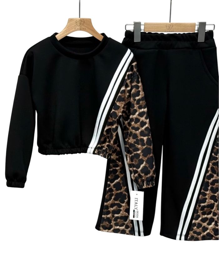 Craquez pour cet ensemble ultra tendance qui mixe parfaitement sportwear & féminité. Confortable, stylé et canon pour toutes vos journées actives ou look chill du week-end. Détails du produit : • Ensemble 2 pièces : sweat + pantalon • Couleur : noir avec bandes blanches & inserts léopard • Coupe décontractée mais flatteuse • Taille élastique • Ultra confortable, doux au toucher • Style Italie Moda – look chic & moderne