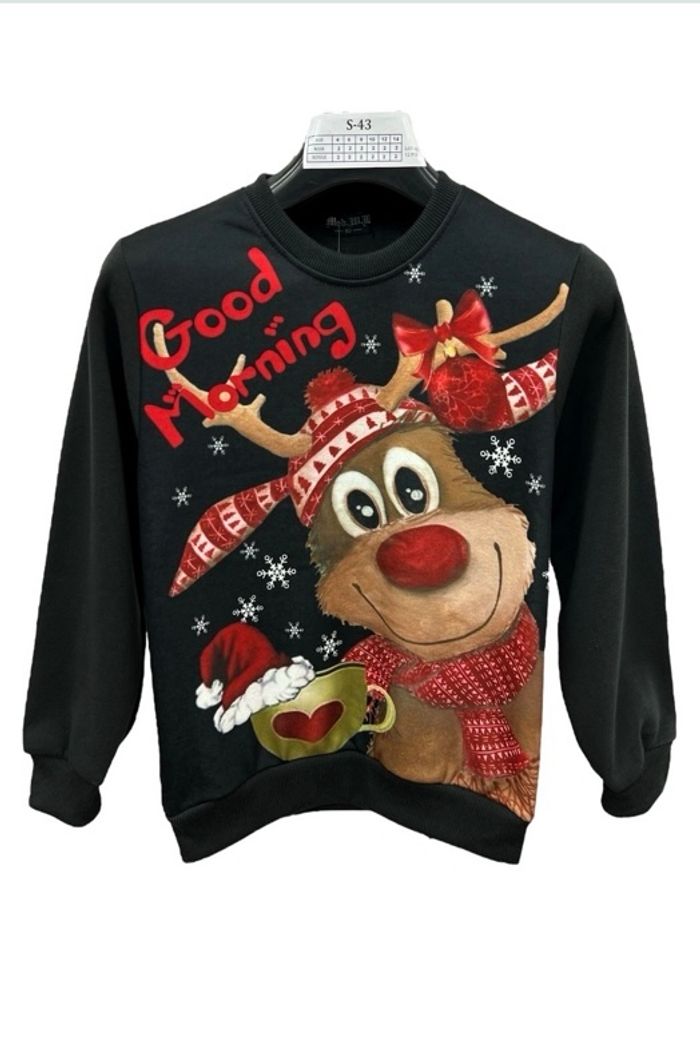 Ambiance douce & festive garantie avec ce sweat de Noël adorable ! On craque totalement pour le renne souriant, sa tasse chaude à la main et ses accessoires hivernaux. C’est la pièce parfaite pour entrer dans la magie des fêtes avec humour et bonne humeur ! Détails du produit : Motif renne de Noël + inscription « Good Morning » Fond noir – idéal à associer avec jean ou pantalon uni Manches longues & col rond Molleton doux & confortable Style fun, cosy & festif