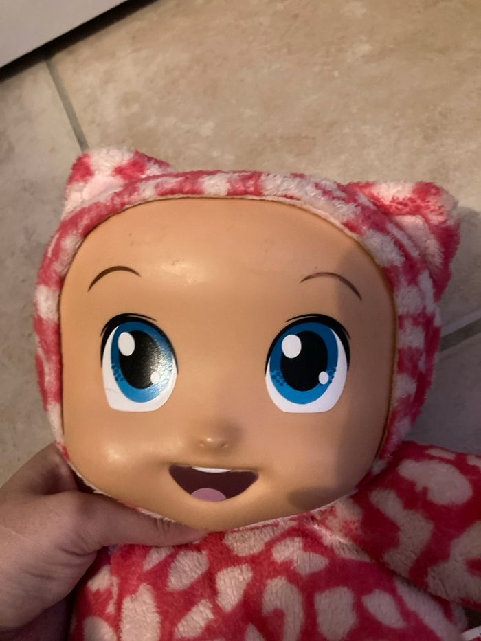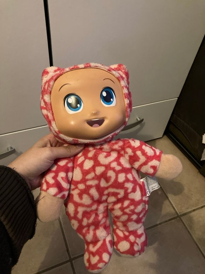 Il est en bon état a part une tâche à côté de l’étiquette et une peut au visage . Envoi rapide et soigné