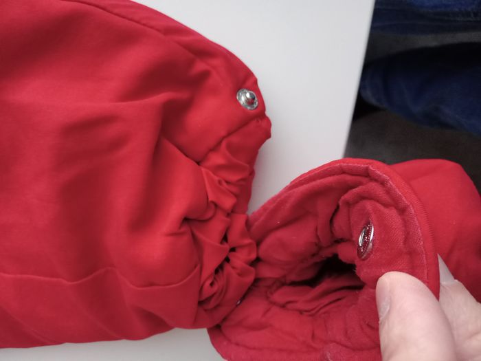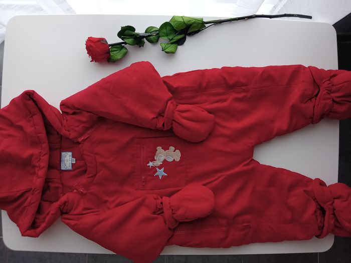 Superbe et pratique combinaison pilote couleur rouge, avec fermeture ventrale par deux glissières, moufles amovibles, chaussons amovibles, capuche, chaude et doublée, couleur aussi bien pour petit garçon que pour petite fille.
