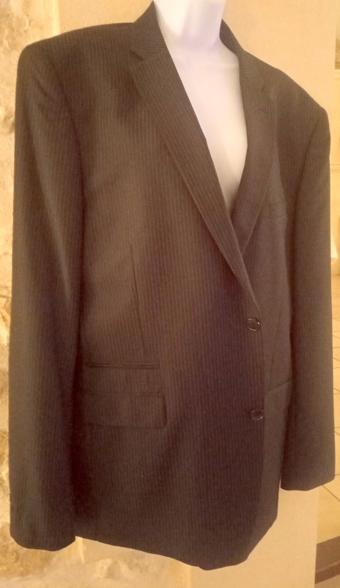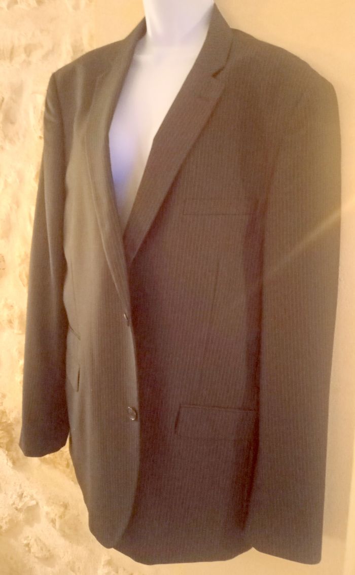 Veste gris foncé à fines rayures, avec un pantalon habillé ou un jean, bel effet, marque Celio club , taille 58/60 , polyester et entièrement doublée. 3 fausses poches cotés, plusieurs poches interne, petits boutons aux bas des manches, poche plaquée poitrine. Dos fermé . Veste Neuve.