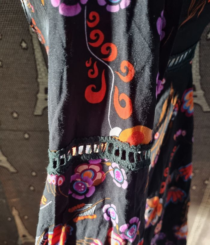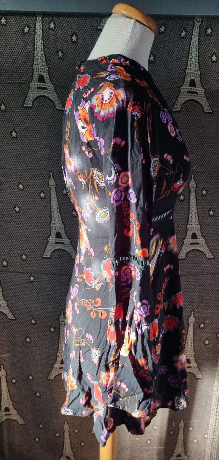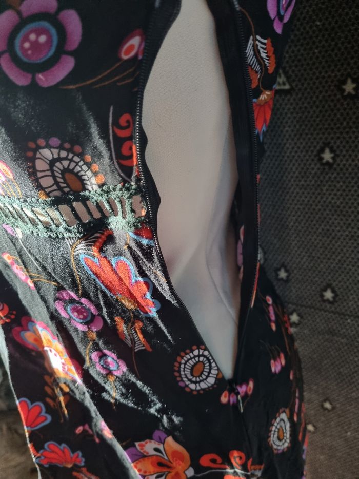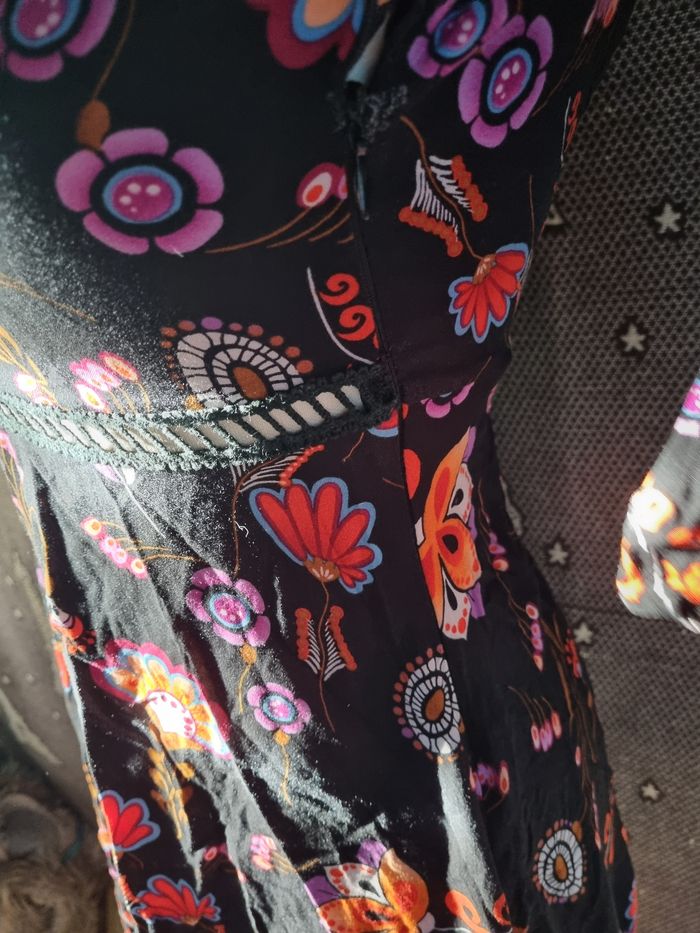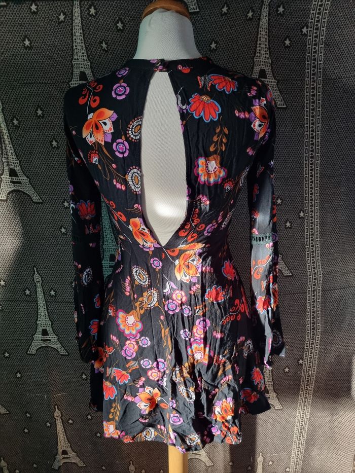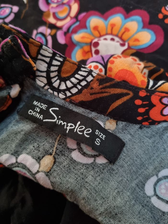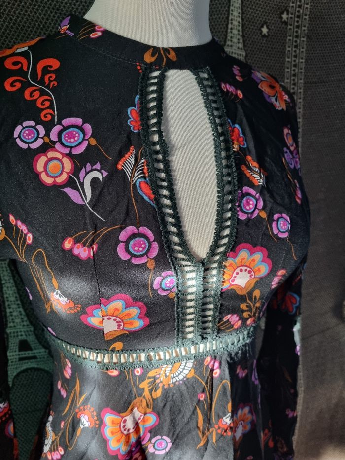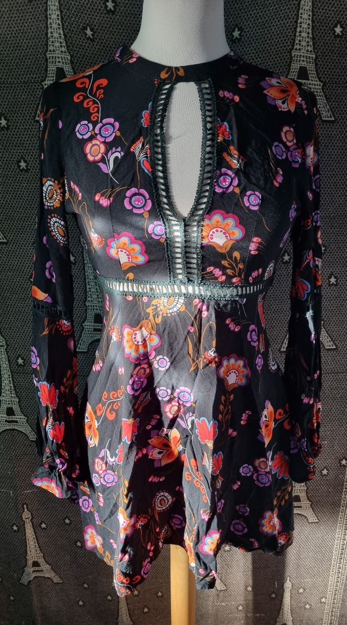 Robe noir à motifs fleurs, taille S marque Simplee ,poitrine et dos ouvert, zip sur un côté, effet broderie poitrine ,manches et à la taille,légère, longueur 81cm, largeur de la taille 34cm, longueur épaule à aisselle 21cm, largeur aisselle à aisselle 42cm, longueur manche 48cm, largeur épaule à épaule 35cm, largeur 60cm,comme neuf très peu porté.