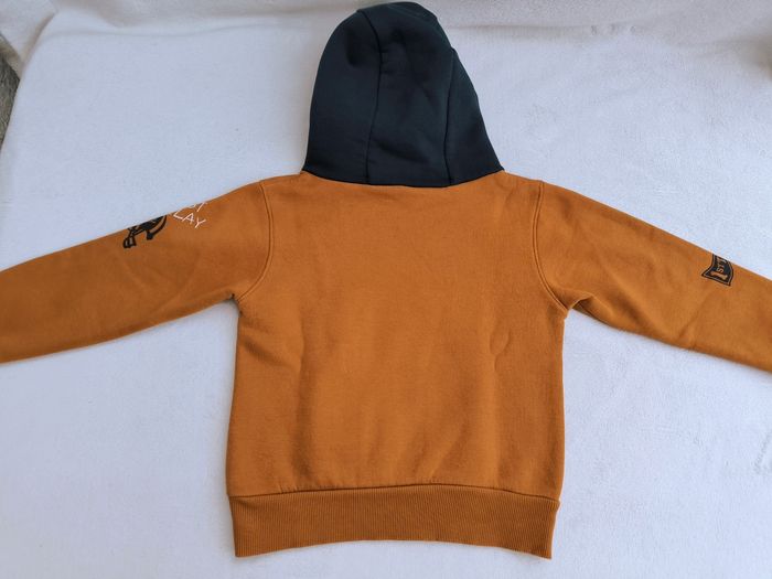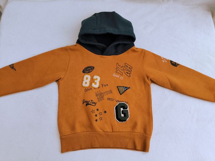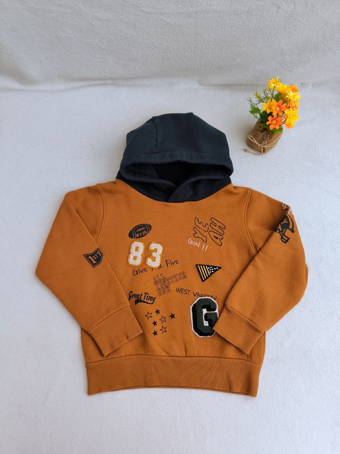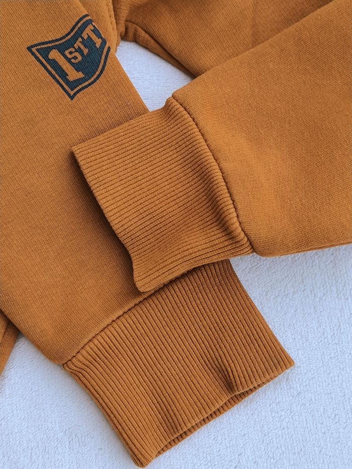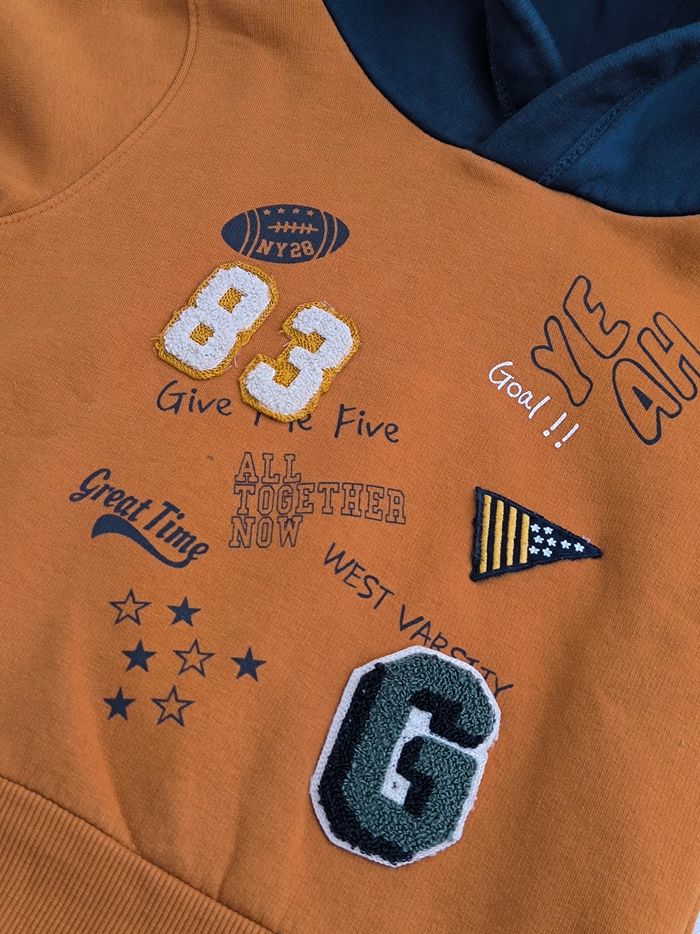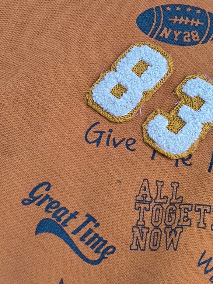 • Inscription brodée en texture "83, G", inscription "Yeah, goal, all together now, great time" imprimé ballon football américain, étoile