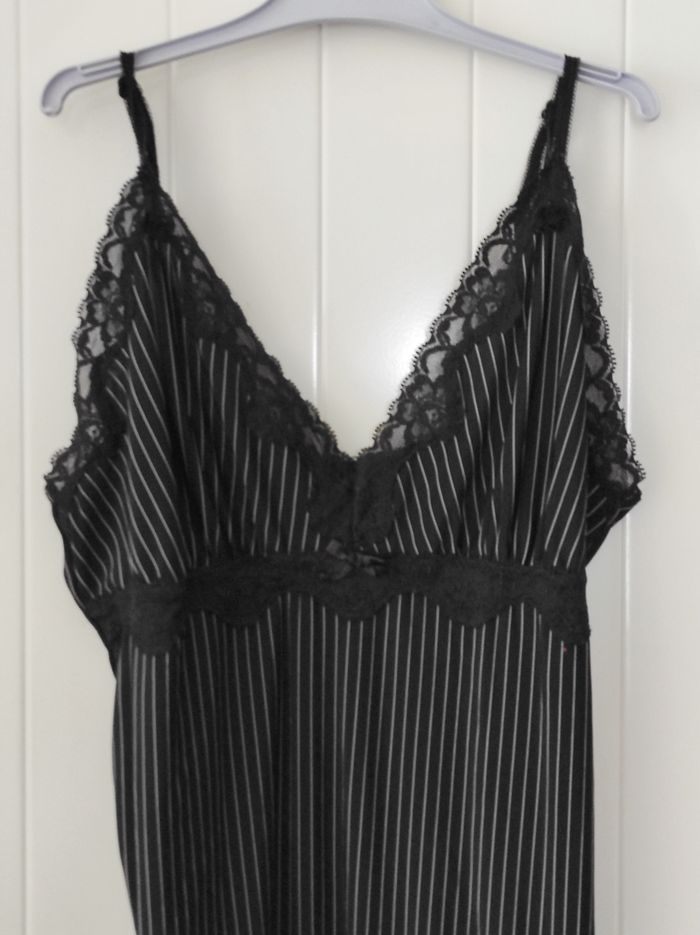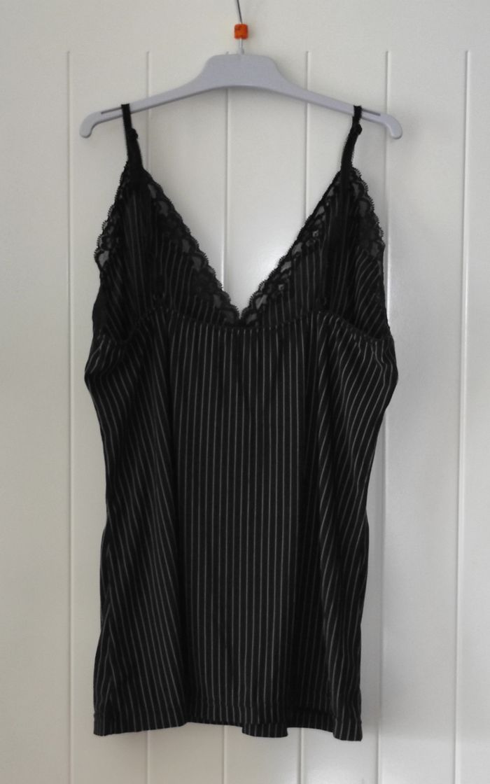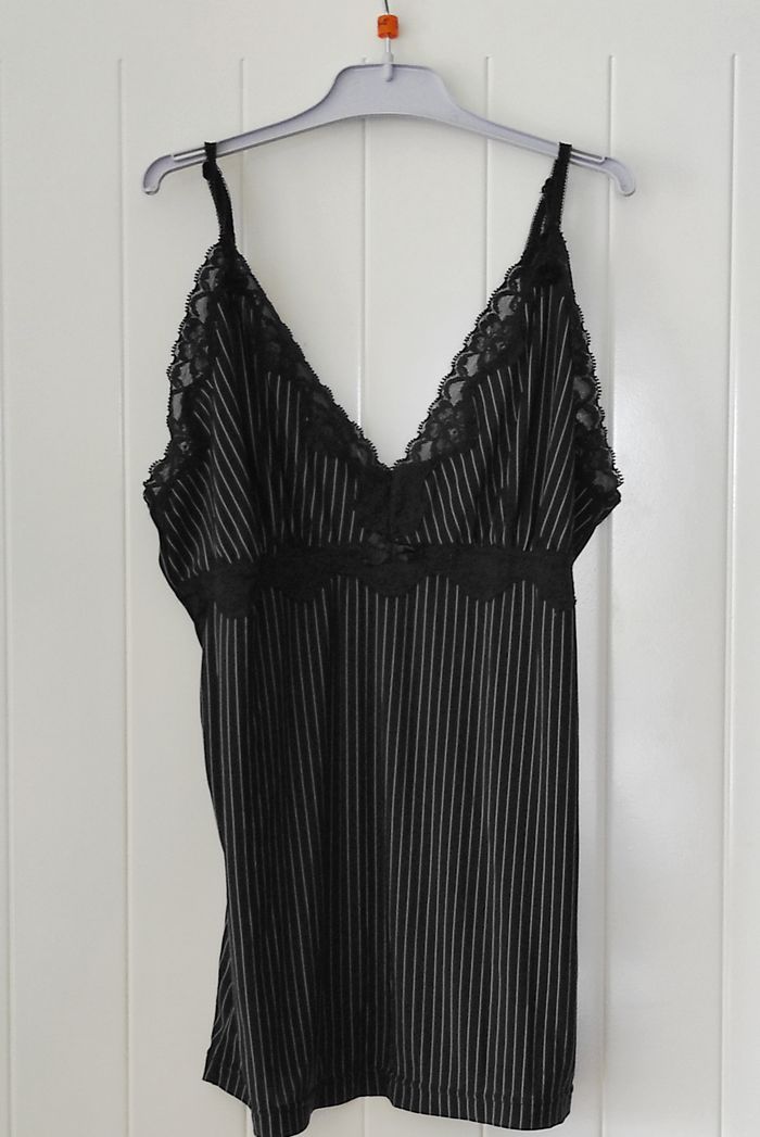 Caraco pour femme en lycra, taille XL, confortable et extensible. Bretelles réglables pour un ajustement parfait et finition dentelle élégante. 🎨 Motif : rayures 🖤 Coloris : gris et noir ✨ Très bon état Idéal sous un gilet, une chemise ou en tenue homewear !