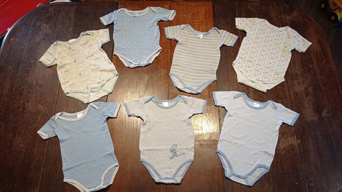 Vend lot de 7 body en plus ou moins bon état (voir photos) : quelques tâches, troues d'usure rien de bien méchant Je vends d'autres vêtements 1 an n'hésitez pas regarder et à me contacter si cela vous intéresse pour éventuellement faire des lots (dans ce cas là je ferai un prix en fonction du lot) ou pour plus de renseignements 😊