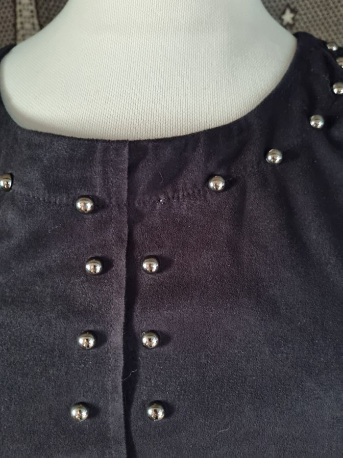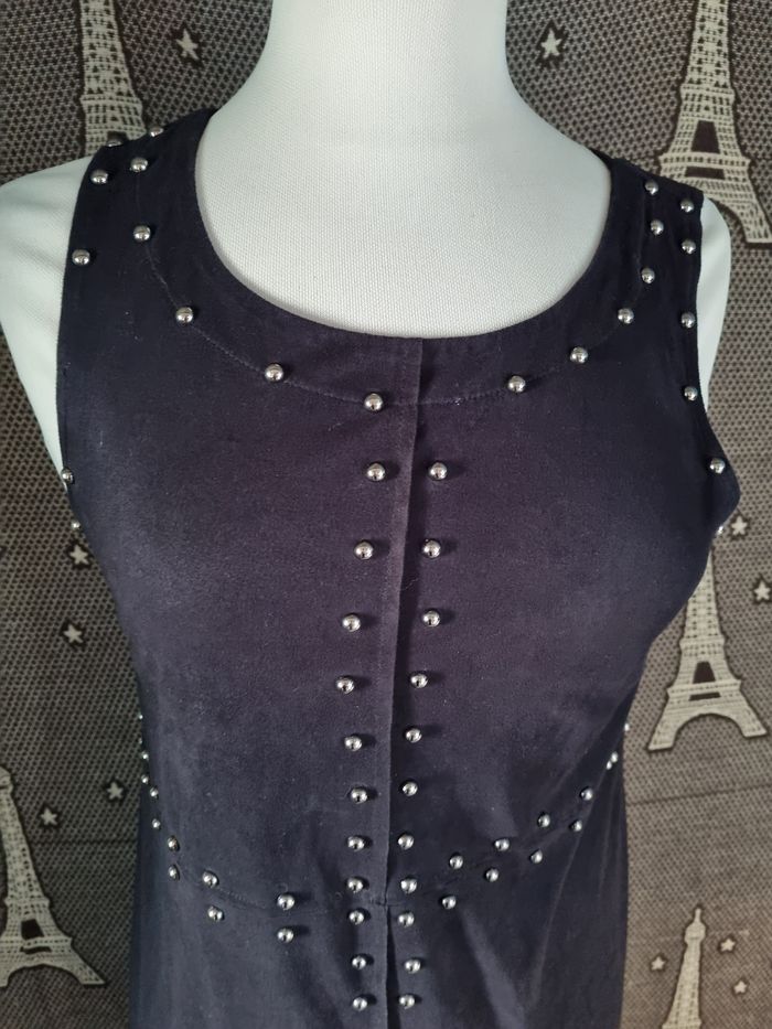 Robe noir à perles effet daim au touché, taille S marque Molly Bracken,sans manches, longueur 84cm, largeur 46cm, longueur épaule à aisselle 22cm, largeur aisselle à aisselle 45cm,largeur épaule à épaule 30cm, manque une perle au col et petit trou voir photos,sinon très bonne état