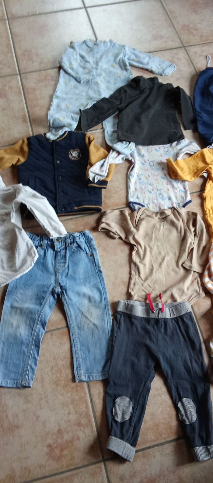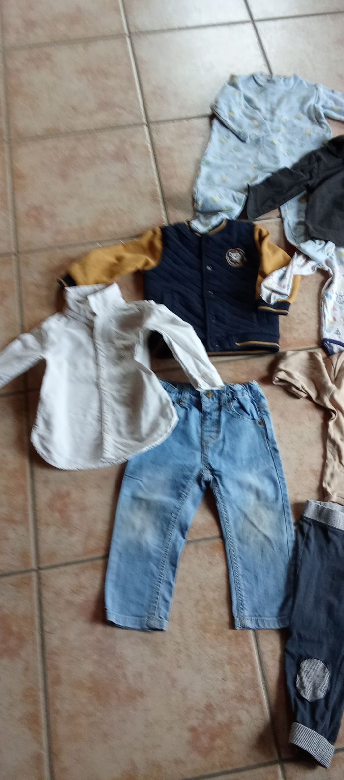 Un peu de tout toutes marques Le jeans un peu sali mais je le laisse Je marque 77/82 car ils disent 18 mois sur les vêtements donc je précise