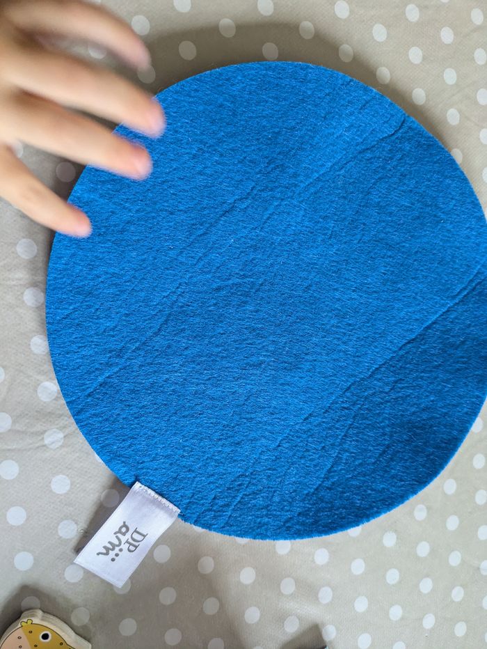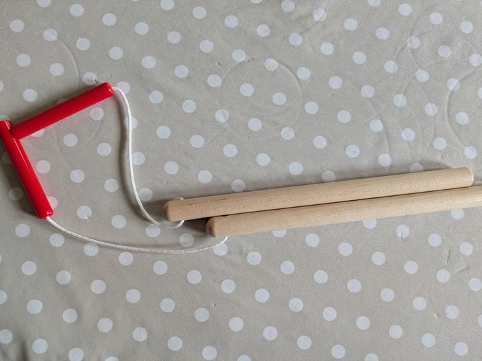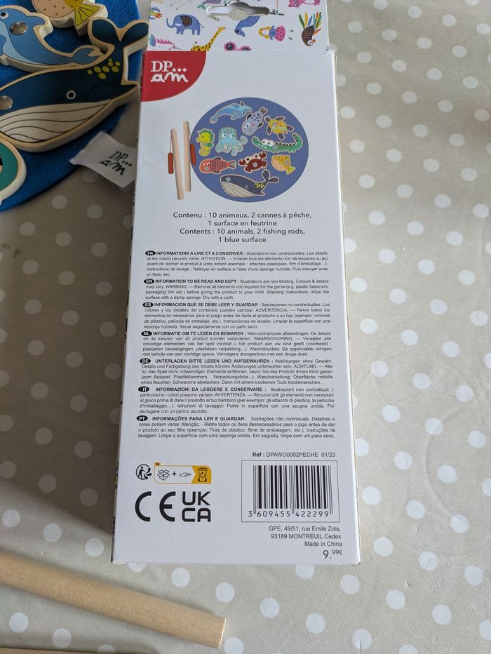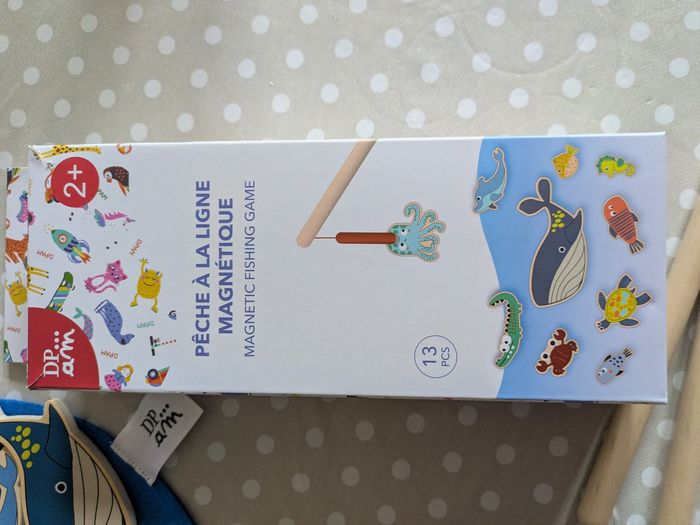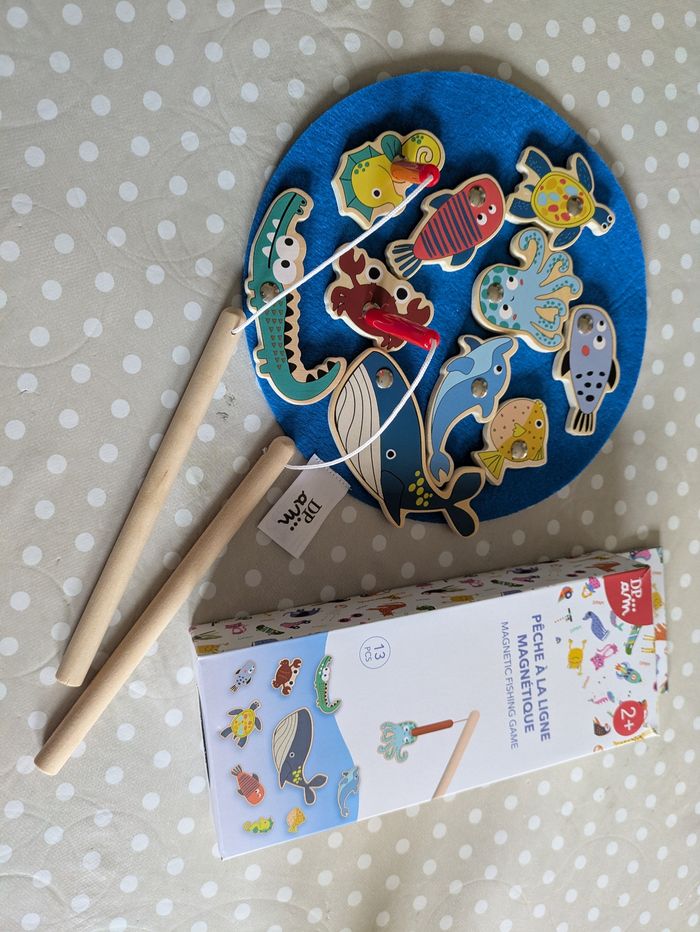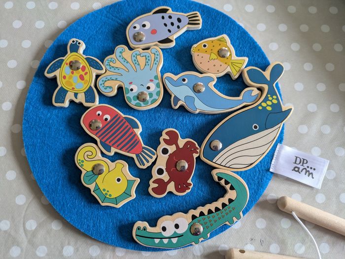 Joli jeu de pêche aux poissons en bois avec 10 poissons, 2 cannes à pêche et un disque bleu en feutrine pour disposer les poissons.