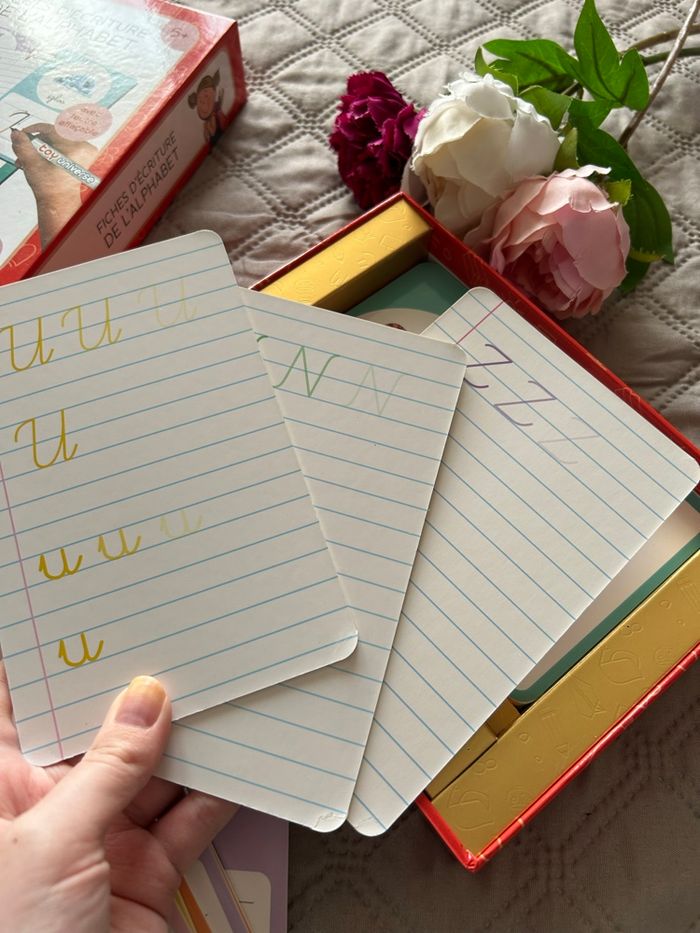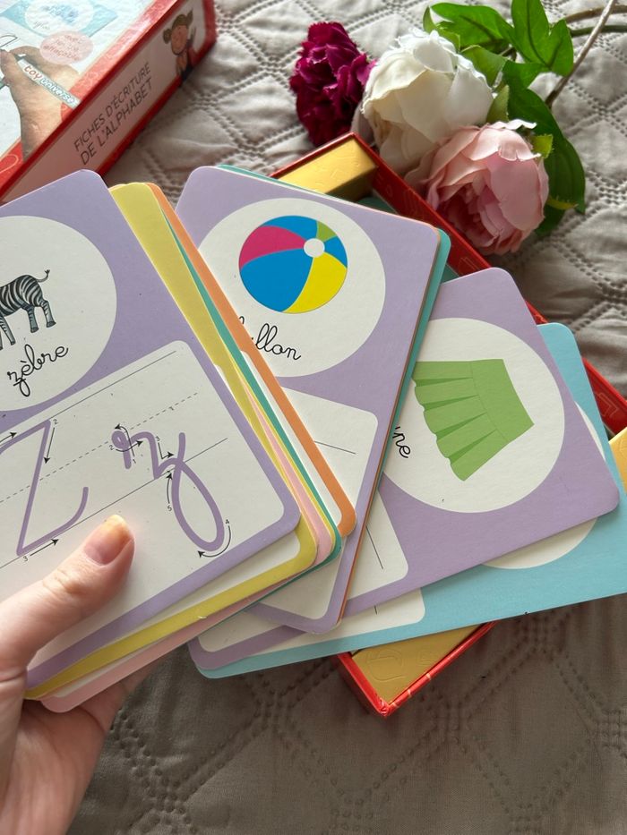 • Principe: Chaque fiche présente la lettre, une illustration du mot associé, et montre le sens du tracé pour bien former la lettre. L'arrière de la fiche est une grille lignée pour s'entraîner à la répétition de la lettre.