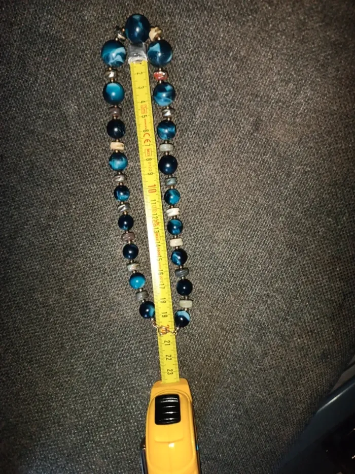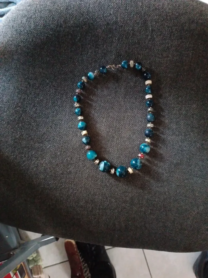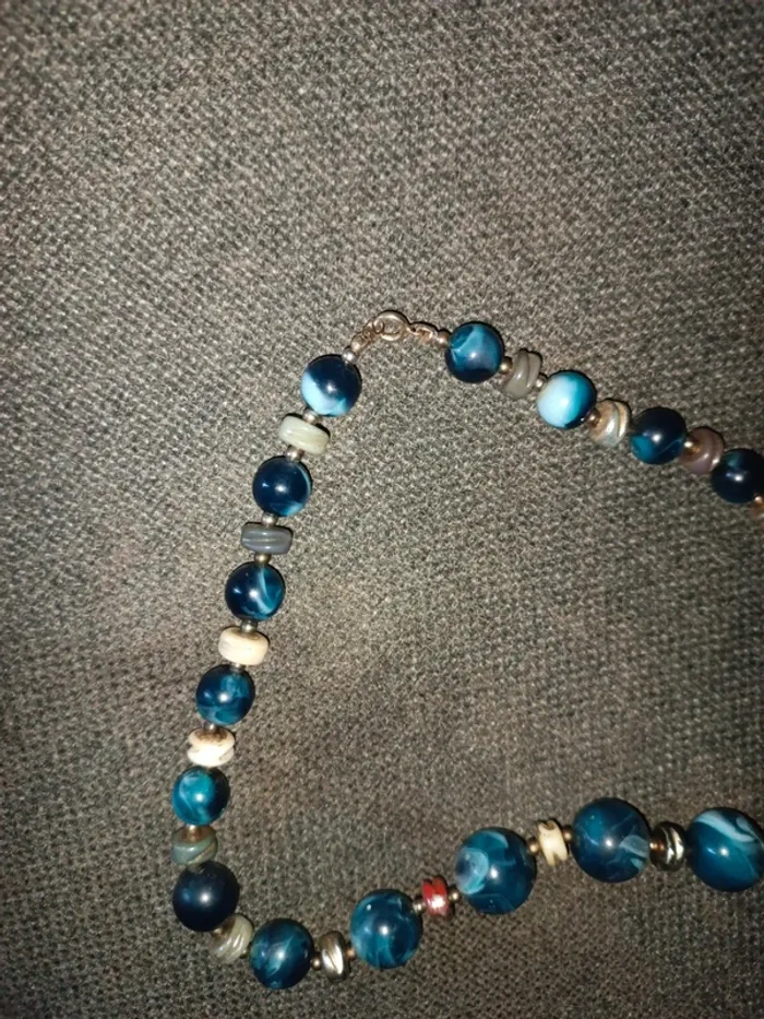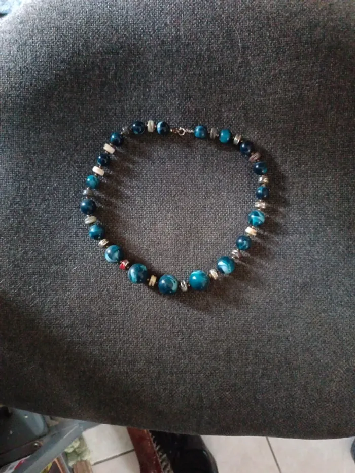 Collier perles bleues. Imitation jaspe. Acrylique . Bon état