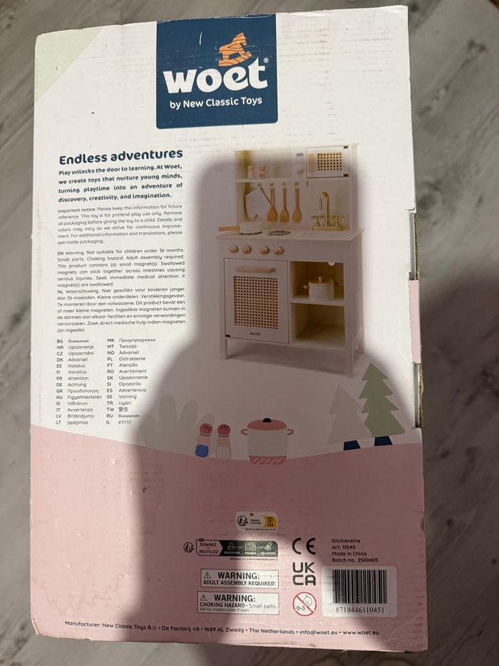 Une jolie cuisine avec tout le nécessaire pour que les petits chefs en herbe se lancent dans des aventures culinaires ! Cette cuisine en bois et rotin dispose d'un plan de travail avec 2 plaques de cuisson, d'un four et d'un micro-ondes pour cuire et réchauffer les plats, d'un évier et d'un robinet pour faire semblant de laver et nettoyer. Les petits chefs cuistots vont pouvoir mitonner de bons petits plats pour leurs convives dès 3 ans grâce aux accessoires fournis avec cette cuisine : une casserole avec couvercle, une poêle, 3 ustensiles, une manique, une salière et poivrière. Les détails en rotin d'aspect naturel ajoutent une touche d'élégance à cette cuisine pour enfant. Que les tout-petits préparent un repas ou jouent au restaurant, cette kitchenette est parfaite pour les jeux de rôle et divertira vos enfants pendant des heures. La hauteur du plan de travail est de 55 cm. Cuisine en bois et rotin, une cuisine pour enfant de la marque New Classic Toys. Référence 11045. Couleur : - rose