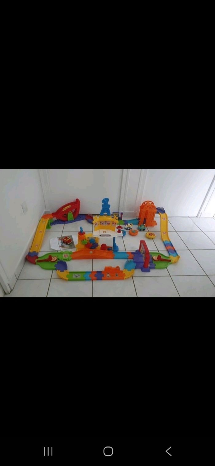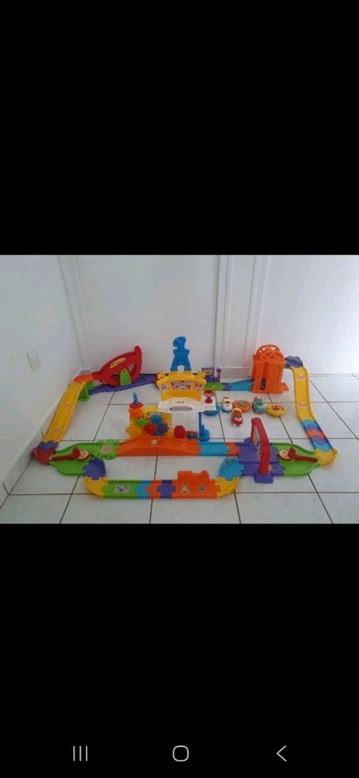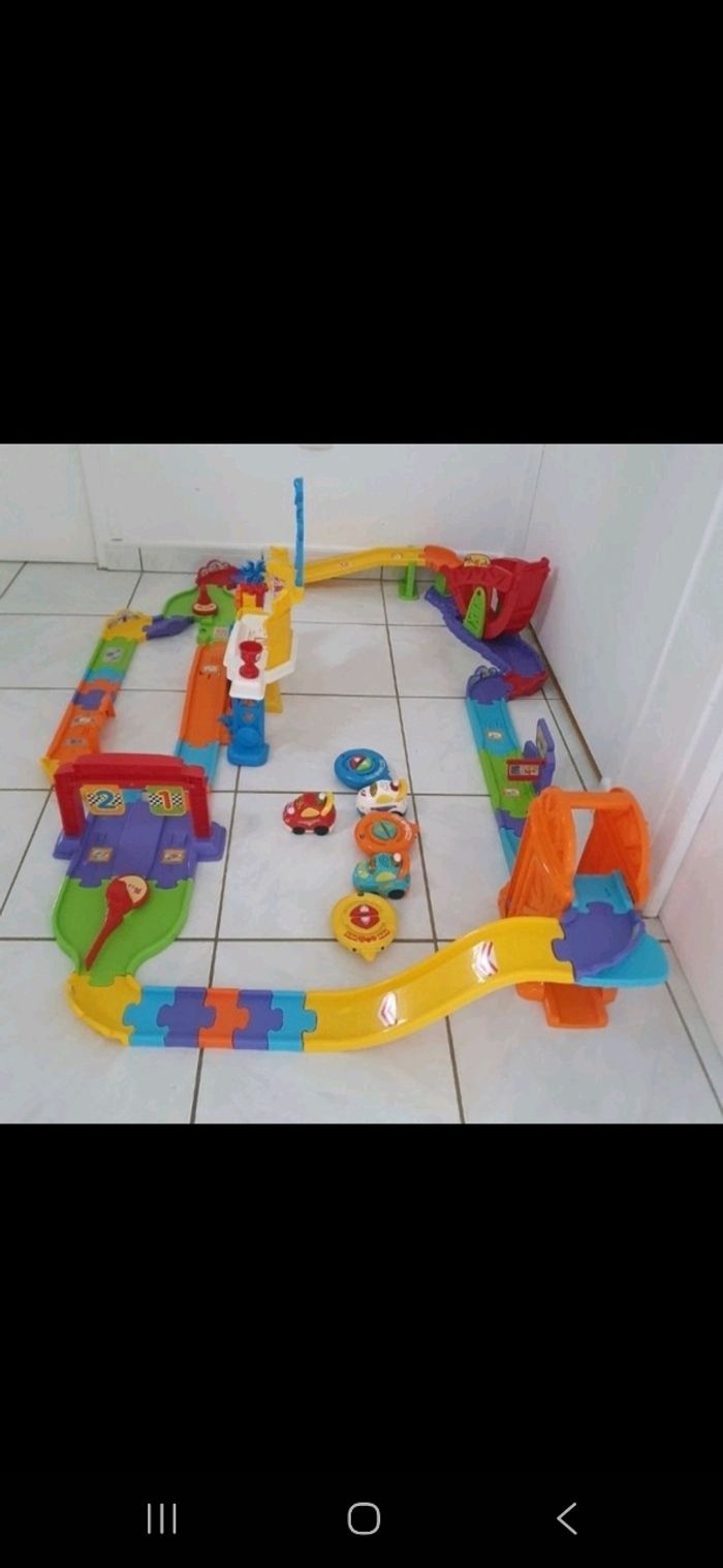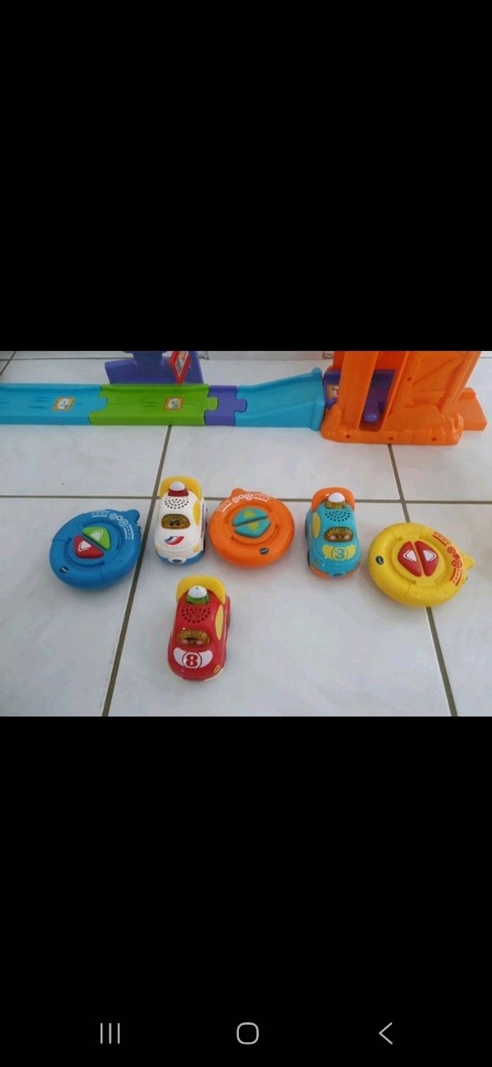 Mon super circuit radiocommandé Pistes pour Tut tut bolides radiocommandées possibilité de raccorder d'autres éléments de la même marque grâce à une pièce quadruple. Ascenseur mécanique (monte tout seul au passage de la voiture) Bascule géante Double piste Zones magiques Engrenages se déclenchant au passage de la voiture Vendu avec3 voitures: Lois <Super police > qui fonctionne parfaitement sur le circuit avec sa télecommande et j'ajoute Hugo "Super turbo" et Matteo "Super Turbo" qui avancent mais ont plus de mal à monter |'ascenseur (mais possibilité de faire monter |'ascenseur à la main) + 1 télécommande (j'en ai une 3ème que je n'arrive plus à faire fonctionner). Toutes les télécommandes/ voitures sont interchangeables grâce au choix du canal sur la voiture et la télécommande. 3 canaux possibles Nécessite piles LRO3/AAA (voitures et télécommandes). ll y a encore des piles sur les 2 télécommandes fonctionnelles 2 voitures (faiblardes sur la3eme)