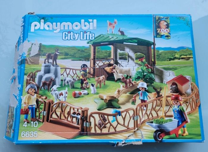 PLAYMOBIL CITY LIFE 6635- PARC ANIMALIER AVEC VISITEURS Viens faire un câlin aux lapins et aux hamsters ! Parc animalier avec 4 personnages, un enclos comprenant de nombreux animaux (chèvre, cochons, moutons, lapins, oiseaux) des abris et des accessoires (paille, herbe, nourriture pour les animaux). En très bon état, il ne manque que le loquet de l'enclos sinon complet, avec notice et boîte ( boîte un peu abîmée) Mes autres playmobils : #playmobilmooglou