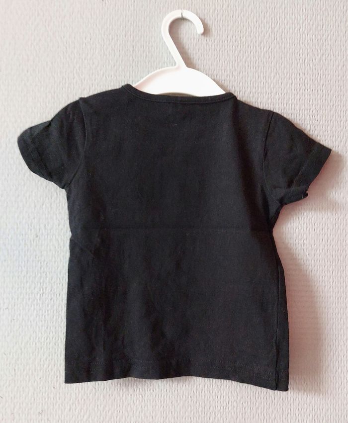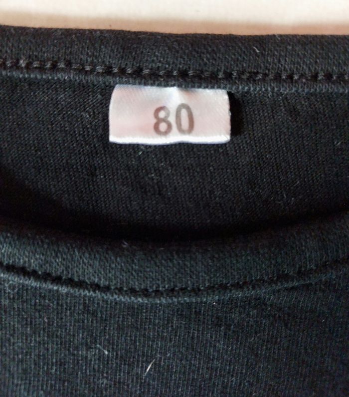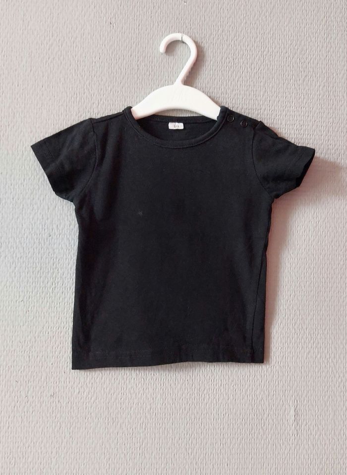 Je vends un t-shirt de couleur noir venant de chez Zeeman. Des boutons à pression sont présents près du cou pour facilité le passage de la tête. Attention : il y as une tâche sur le devant (voir photo). Taille : 80. En très bon état.