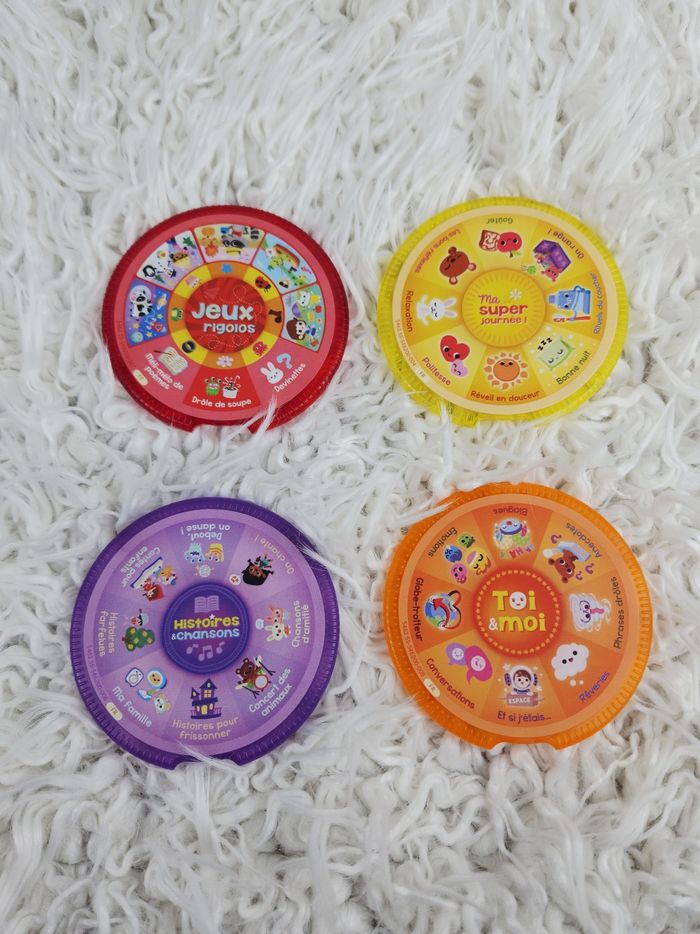 ✴️ 4 disques de jeu à insérer pour des heures de jeu et des thématiques différentes : Jeux et astuces autour des différents moments de la journée / Conversations avec Sunny : encourage l’imagination à travers le jeu et l’exploration / Histoires et chansons pour rire et s’évader / Jeux