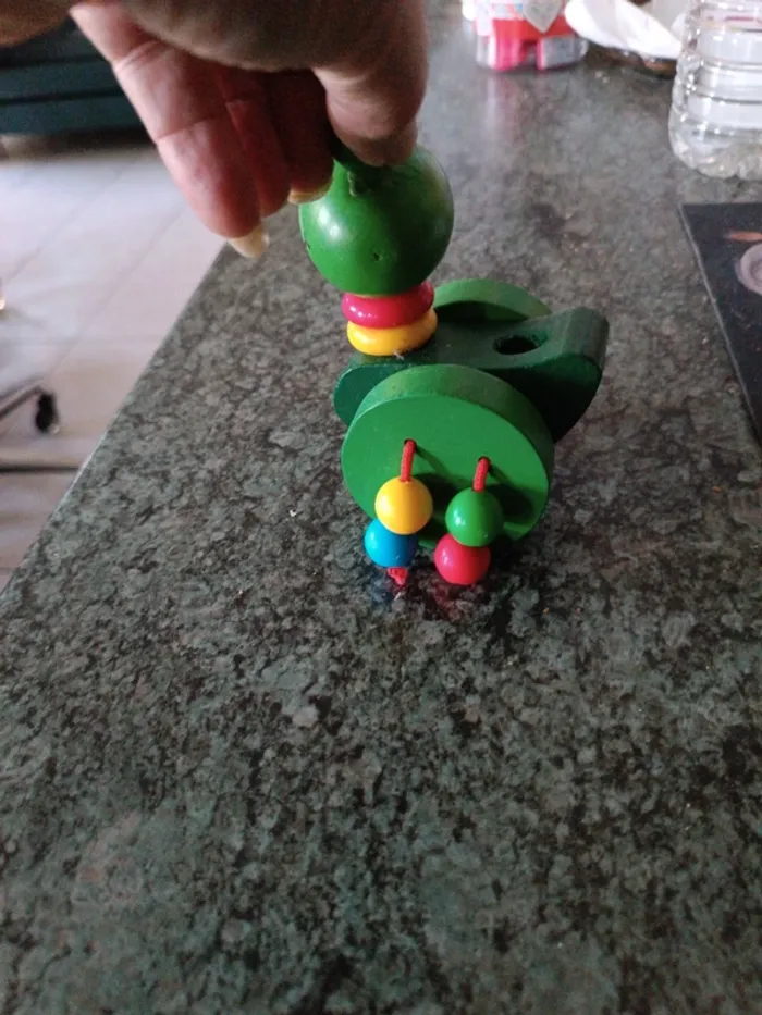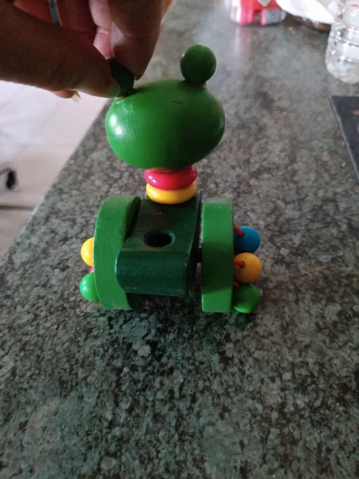 Grenouille à roulettes en bois à tirer. Manque son parapluie. Bon état.