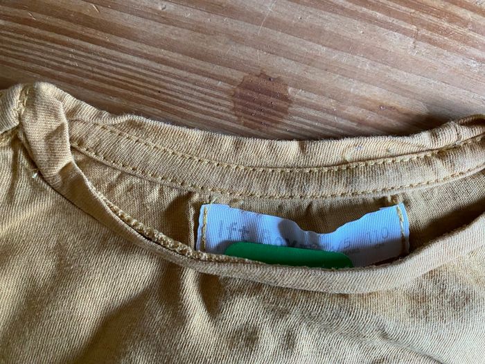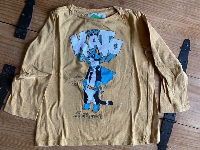 Je vends ce t-shirt enfant jaune moutarde avec un motif de chat super héros. Mdr boys. Très bon état peu porté