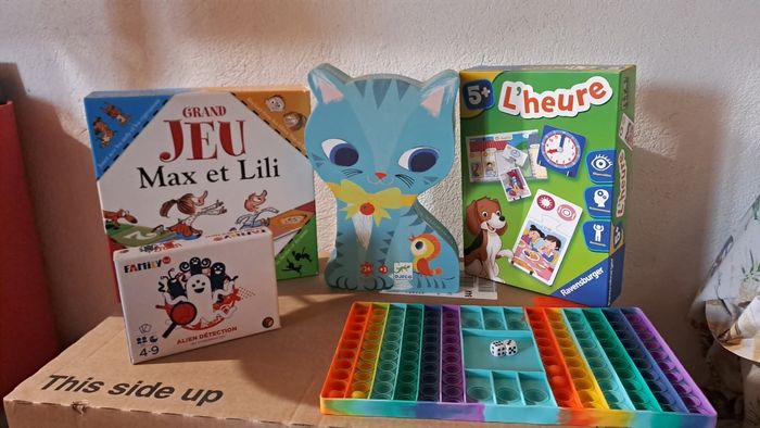 Lot de jeux 25 euros ou à l'article vends divers jeux : -Jeu Tresor Detector Bon état complet avec boite et notice Cartes defis encore sous blister 5 euros -Grand jeu Max et Lili bon état, complet,juste la boîte un peu abîmée dans les coins 5 euros - jeu pop up avec dés : 5 euros très bon état ⭐️ -puzzle 24 pièces Djeco très bon état 5 euros⭐️ -jeu de société Alien détection oxybul ⭐️3 euros bon état _jeu pour apprendre l'heure complet très bon état ⭐️ 5 euros⭐️