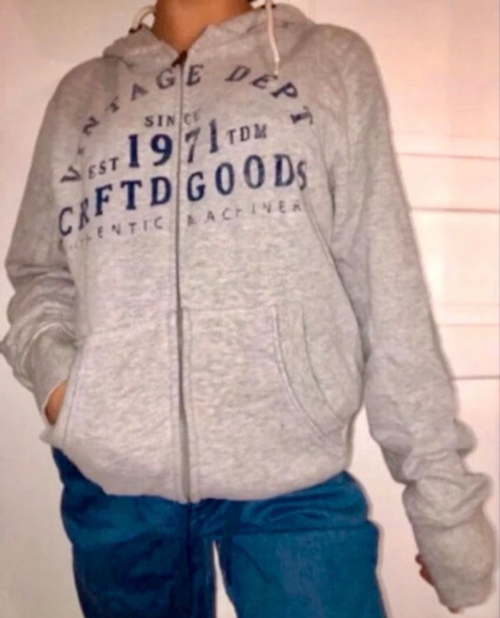 Veste de sport avec capuche couleur gris et écriture couleur bleu bon état taille s