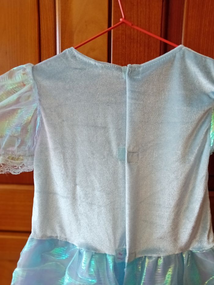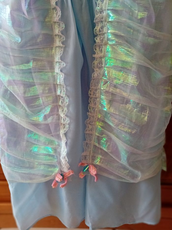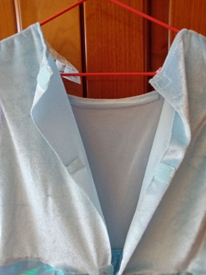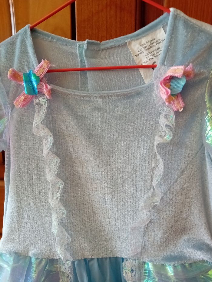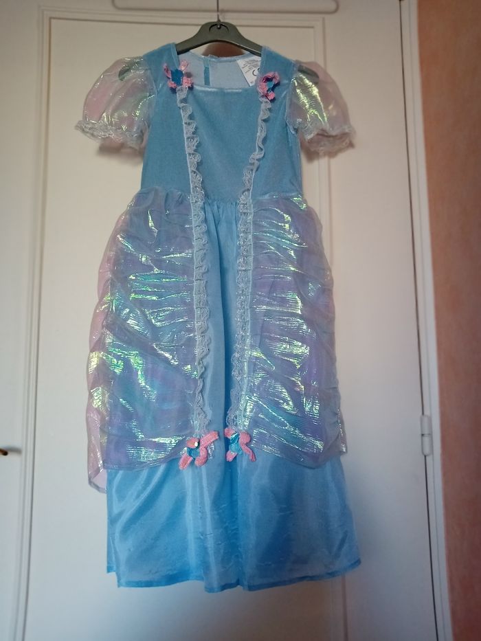 Déguisement Robe de Princesse - Taille 4/5 Ans - Coloris bleu ciel, dentelle blanche, nœuds roses et bleus - 100% Polyester - 3 scratchs au dos pour mettre et enlever facilement la robe - Longueur totale de l'épaule au bas 86 cm - Bon état - Livraison ou remise en mains propres sur Paris.
