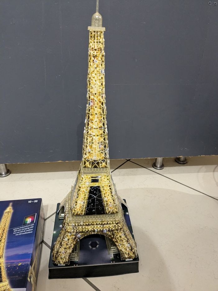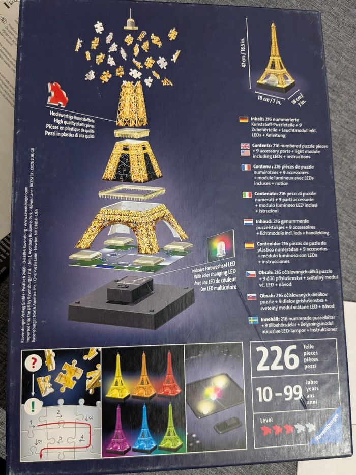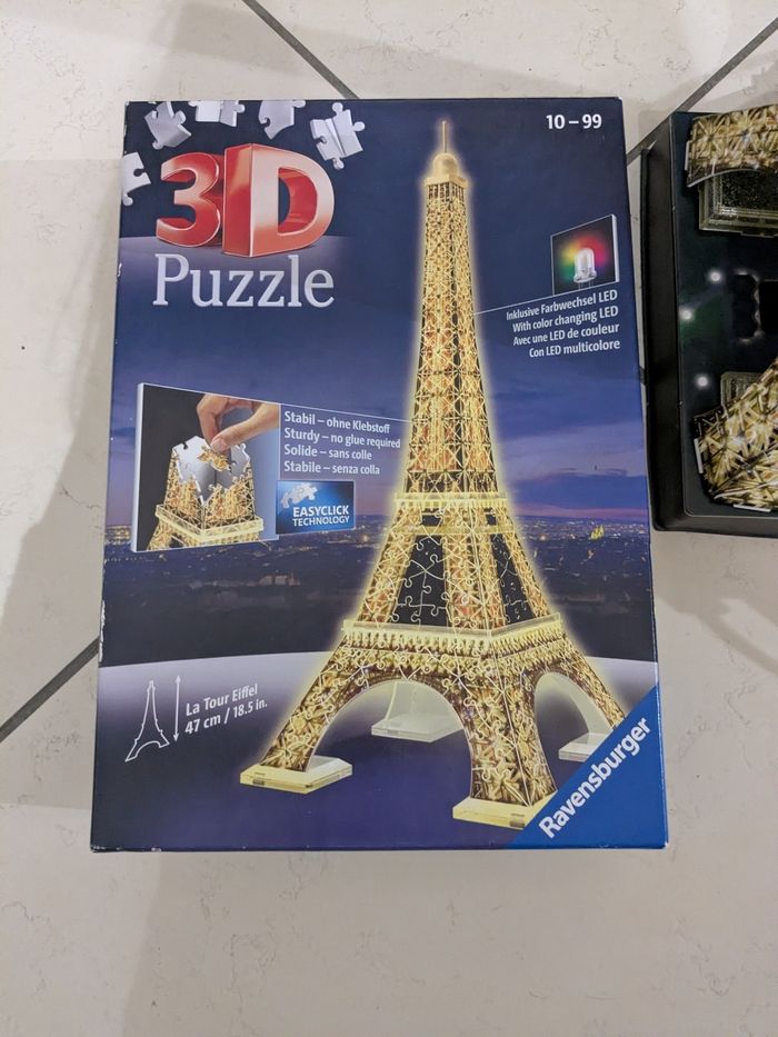 Puzzle 3D tour Eiffel Ravensburger Complet, en très bon état Avec boîtier d'éclairage ( piles non fournies) A retirer à Aigrefeuille sur Maine Envoi possible à votre charge