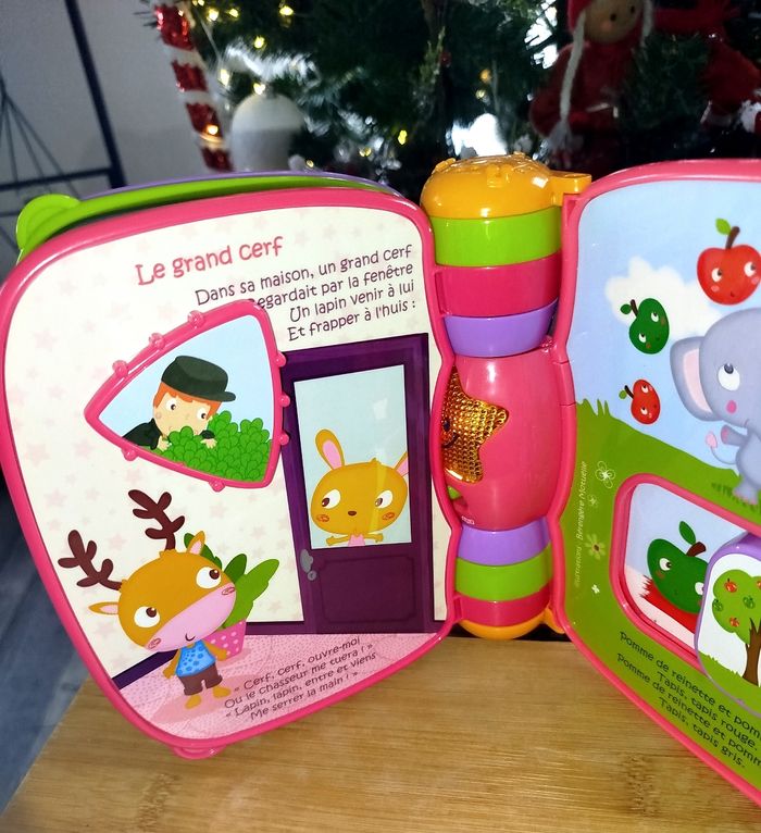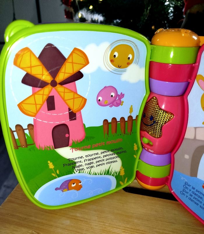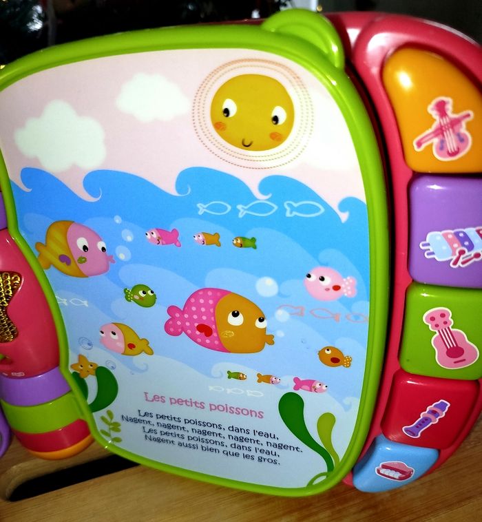 🎁 Comme Neuf 🔋🔋🔋 Piles fournies Un livre parlant et musical avec 6 comptines à écouter : Meunier tu dors Les petits poissons 🐟 Tourne petit moulin Sur le pont d'Avignon Le grand cerf Pomme 🍎de reinette 5 boutons colorés pour jouer du piano et découvrir différents instruments de musique et leur son. Des objets en relief à manipuler pour déclencher des effets sonores et des petites phrases .Etoile lumineuse qui attire l'œil de Bébé. Nécessite des piles : 2 x aaa incluses Age minimum : 6 mois