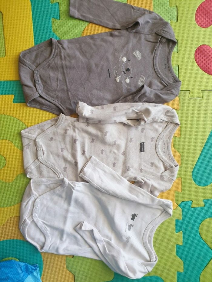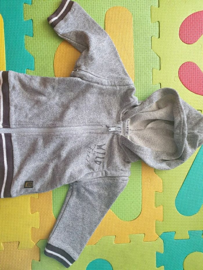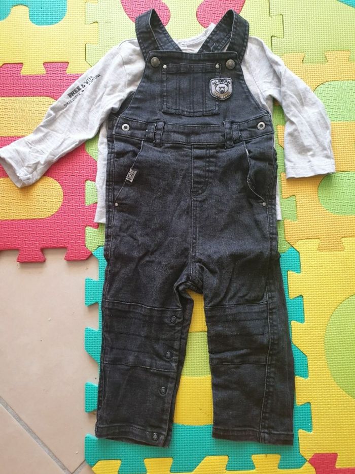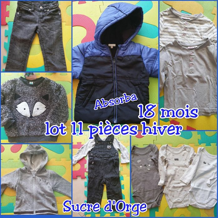 Lot vêtements 11 pièces 18 mois comprenant : 5 pieces marque Sucre d'Orge : 1 ensemble salopette et t-shirt manches longues 3 bodies manches longues 1 sweat avec manches dé-zippables pour le transformer en gilet Et 1 blouson marque Absorba 2 t-shirt manches longues Un sweat polaire 1 jean