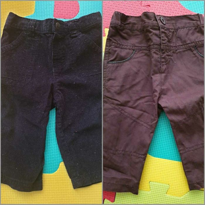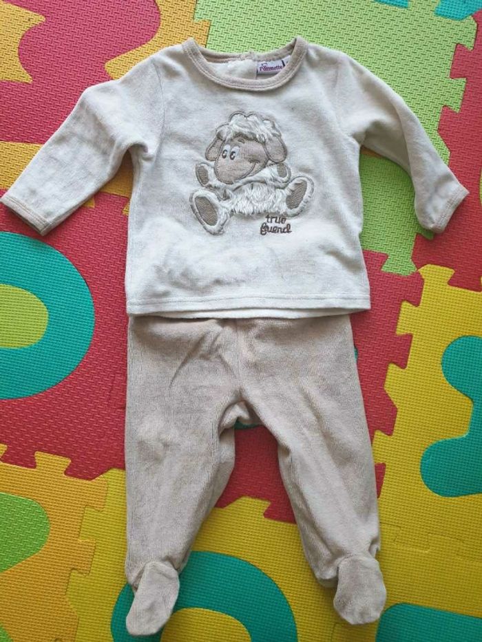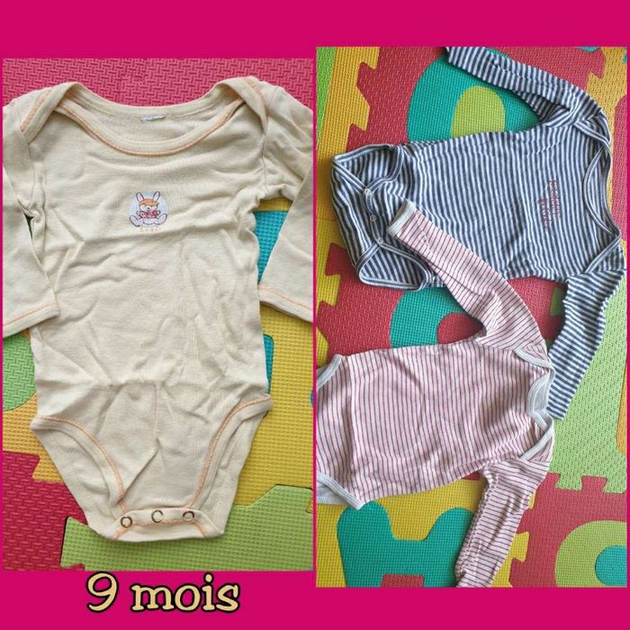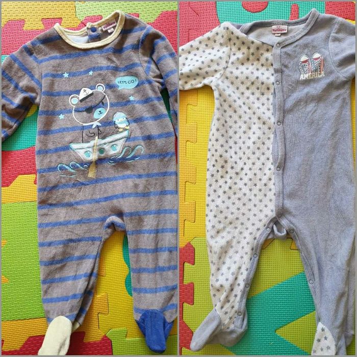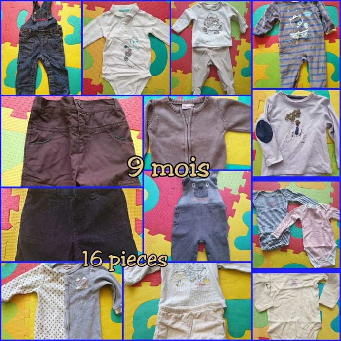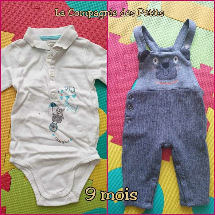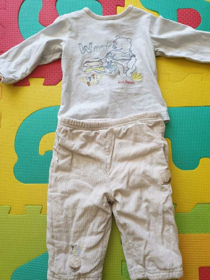 Lot 16pces comprenant 2 pantalons 2 pyjamas une pièce 1 pyjama 2 pce 1 salopette jean 1 ensemble "la compagnie des petits" salopette body 3 bodies manches longues 1 ensemble 2 pce Winnie l'ourson (l'élastique du pantalon est un peu détendu) 1 t-shirt 1 pull zippé