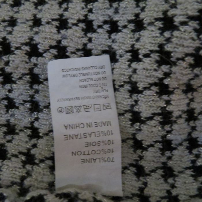 Sublime gilet/veste ouverte au motif pied-de-poule noir et blanc, avec un léger fil métallisé pour une touche élégante et lumineuse ! Parfait pour un look habillé comme décontracté. ✔️ Coupe drapée flatteuse ✔️ Maille douce et confortable ✔️ Motif classique revisité avec un effet brillant discret ✔️ Qualité épaisse, idéale mi-saison ✔️ Composition : 70% acrylique, 10% coton, 10% soie, 10% élasthanne Taille : L/XL Très bon état ⭐ Idéale avec un jean, un pantalon noir ou une robe pour un look élégant et moderne. 📦 Envoi rapide 💬 N’hésite pas si tu veux plus de photos !