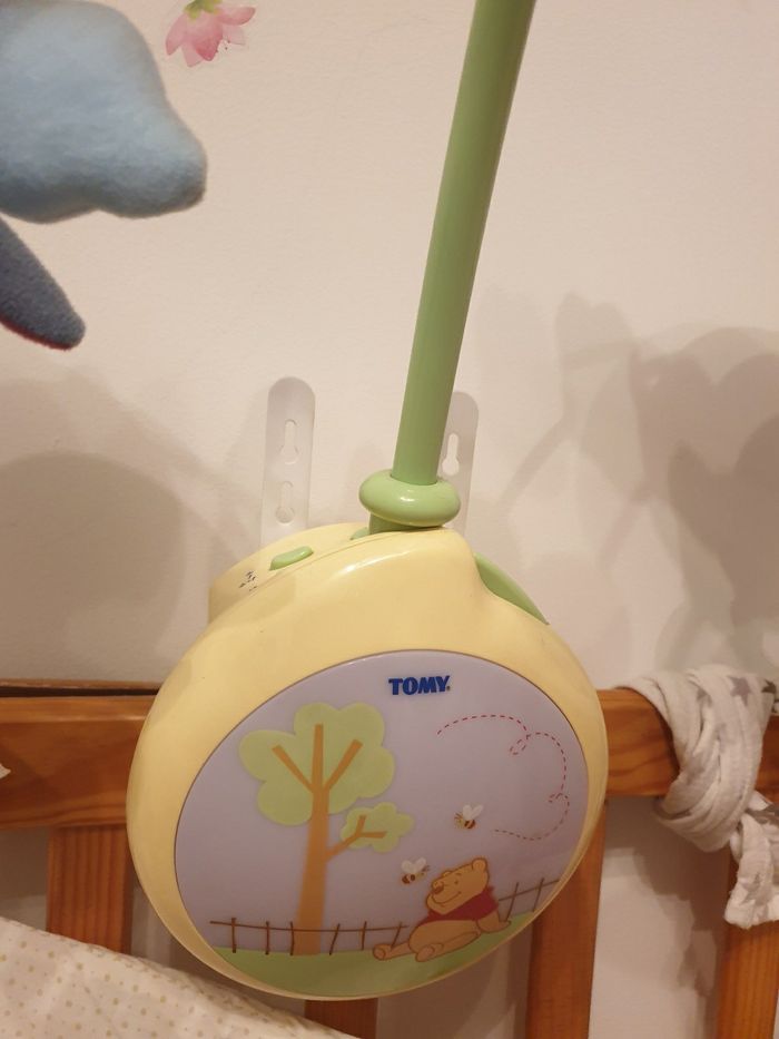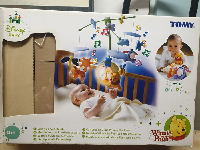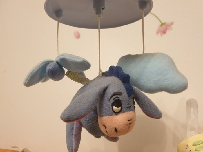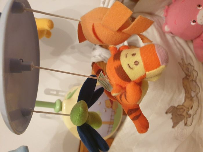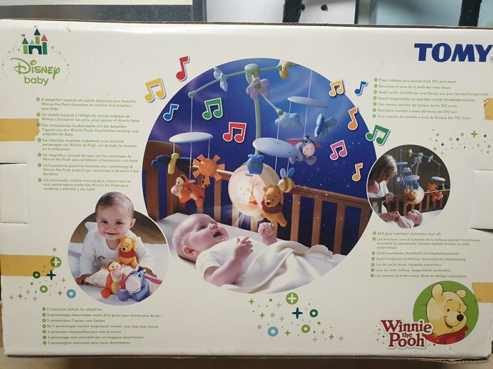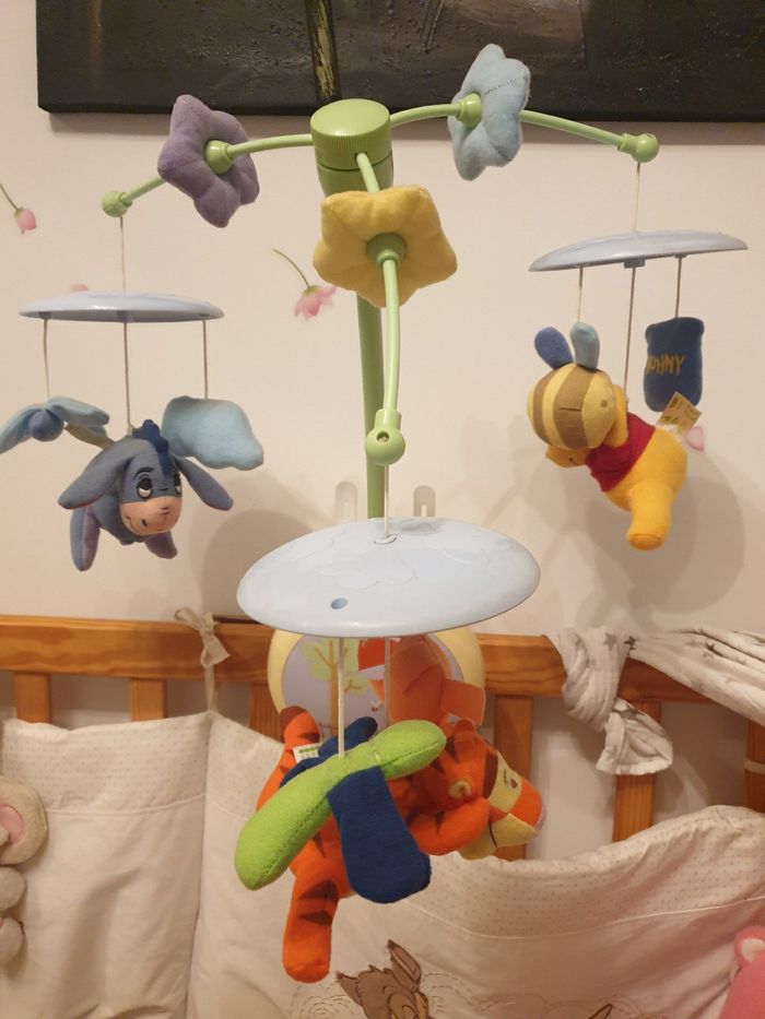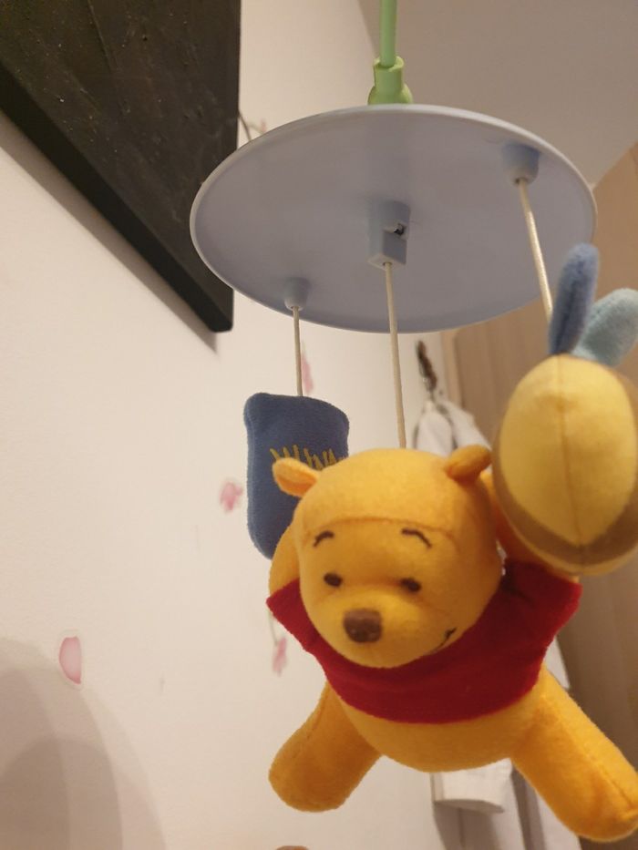 Mobile musical winnie en parfait état, berceuses et sons de la forêt des rêves bleus, les fonctions sons et lumières peuvent fonctionner ensemble ou séparément, volume réglable et mise en veille automatique. 3 personnages détachables. Fonctionne avec 4 piles LR14