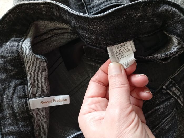 Remise sur lot activé. Jupe en jeans délavé, déchiré au fond, aspect vieilli, en très bon état. Couleur grise. 4 poches. Fermeture par zip et bouton. Légèrement extensible. Longueur du genou. Marque : Sweet Fashion Taille: M 36-38 Mesures approximatives Longueur: 61cm Ceinture: 35cm 100% Polyester #jupeenjeans #jupeenjeansdelavee #jupeenjeansdechire #jupeenjeanslongueurgenoux