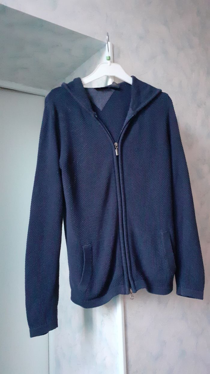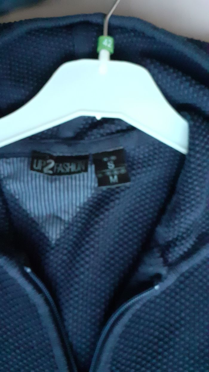 Vends un gilet à capuche en maille, zippé, 50 % acrylique, 50 % coton, 2 poches latérales, couleur bleu marine, marque UP2 Fashion, taille S/M. Longueur de l'épaule à la base : 62 cm Largeur aisselle à aisselle : 44 cm.