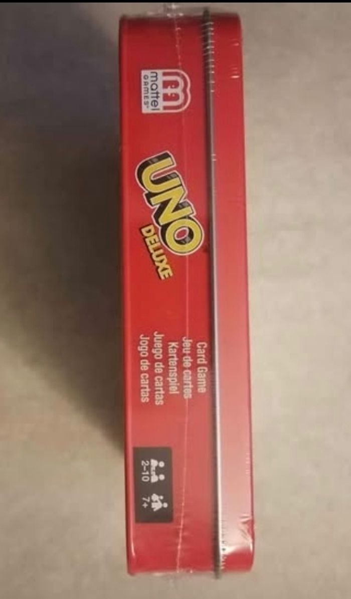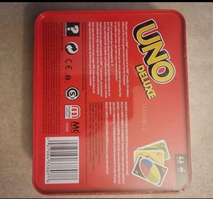 Dans ce célèbre jeu de cartes, vous tentez d'être le premier à marquer 500 points. Pour marquer des points il faut être le premier à se débarrasser de toutes ses cartes en main et les cartes Action vous permettent de compliquer sérieusement la vie de vos adversaires. Quand il ne vous reste plus qu'une carte, n'oubliez pas de crier « UNO ! » Dans la version Deluxe, le jeu est soigneusement rangé dans une boîte en métal colorée qui contient un paquet de 108 cartes, un mode d'emploi, un carnet de score et un crayon.