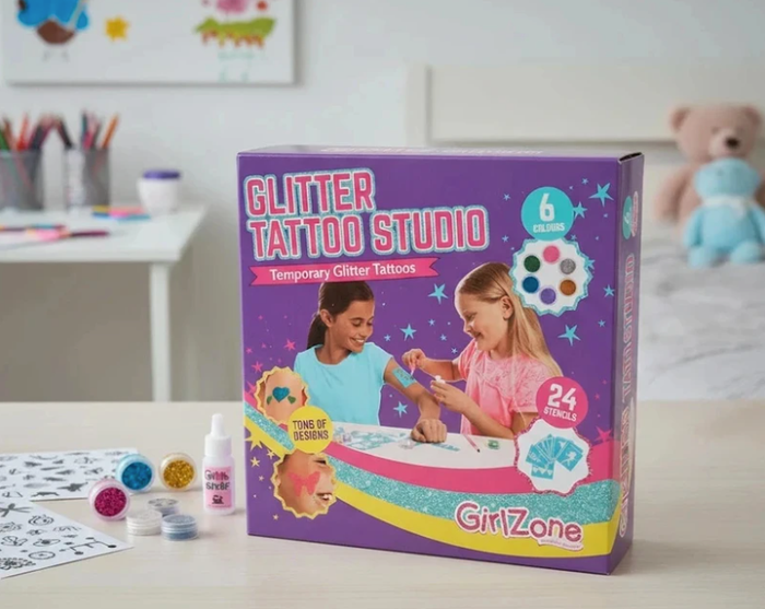 Envie d'ajouter une touche de magie et de créativité ? Découvrez ce superbe Studio de Tatouages Paillettes de la marque GirlZone, idéal pour les enfants (et les grands !) qui aiment briller ! 💖